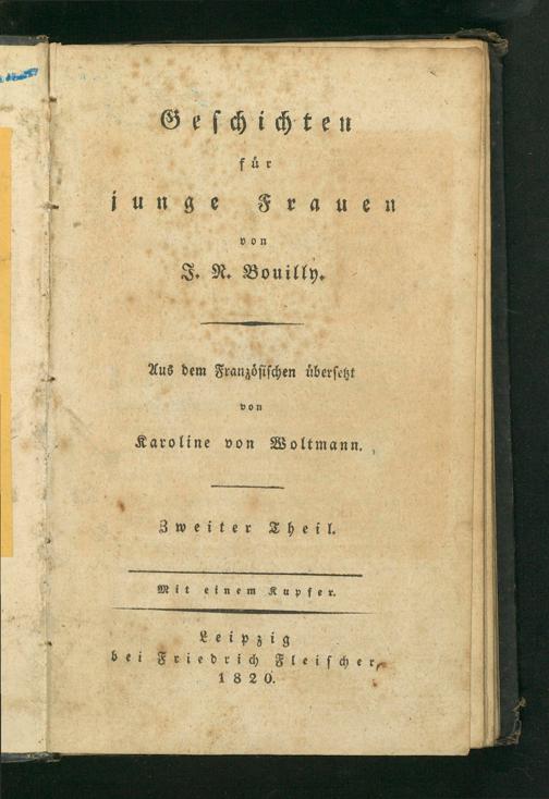 6 von . J. N. Bouilly. Aus dem Franzoͤſiſchen uͤberſetzt von Karoline von Woltmann. 38 weter hi. Mit einem Kupfer. 1 bei Friedrich Fteiſcher
