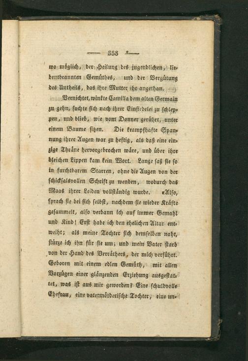 wo moͤglich, der Heilung des jugendlichen, lie⸗ bentbrannten Gemuͤthes, und der Verguͤtung des Untheils, das ihre Mutter ihr angethan.) WVernichtet, winkte Camilla dem alten Germain zu gehn, ſuchte ſich nach ihrer Einſiedelei zu ſchlep⸗ pen, und blieb, wie vom Donner geruͤhrt, unter einem Baume ſitzen. Die krampfhafte Span⸗ nung ihrer Augen war zu heftig, als daß eine ein⸗ zige Thraͤne hervorgebrochen waͤre, und uber ihre bleichen Lippen kam kein Wort. Lange ſaß ſie ſo in furchtbarem Starren, ohne die Augen von der ſchickſalsvollen Schrift zu wenden, wodurch das Maas ihrer Leiden vollſtaͤndig wurde.„Alſo, ſprach ſie bei ſich ſelbſt, nachdem ſie wieder Kräfte geſammelt, alſo verbann ich auf immer Gemahl und Kind! Erſt habe ich den ehelichen Altar ent⸗ weiht; als meine Tochter ſich demſelben naht, ſturze ich ihn fuͤr ſie um; und mein Vater ſtarb von der Hand des Verräthers, der mich verfuͤhrt. Geboren mit einem edlen Gemuͤth, mit allen Vorzugen einer glänzenden Erziehung ausgeſtat⸗ tet, was iſt aus mir geworden? Eine ſchuldvolſe Ehofrau, eine vatermoͤrderiſche Tochter, eine un⸗