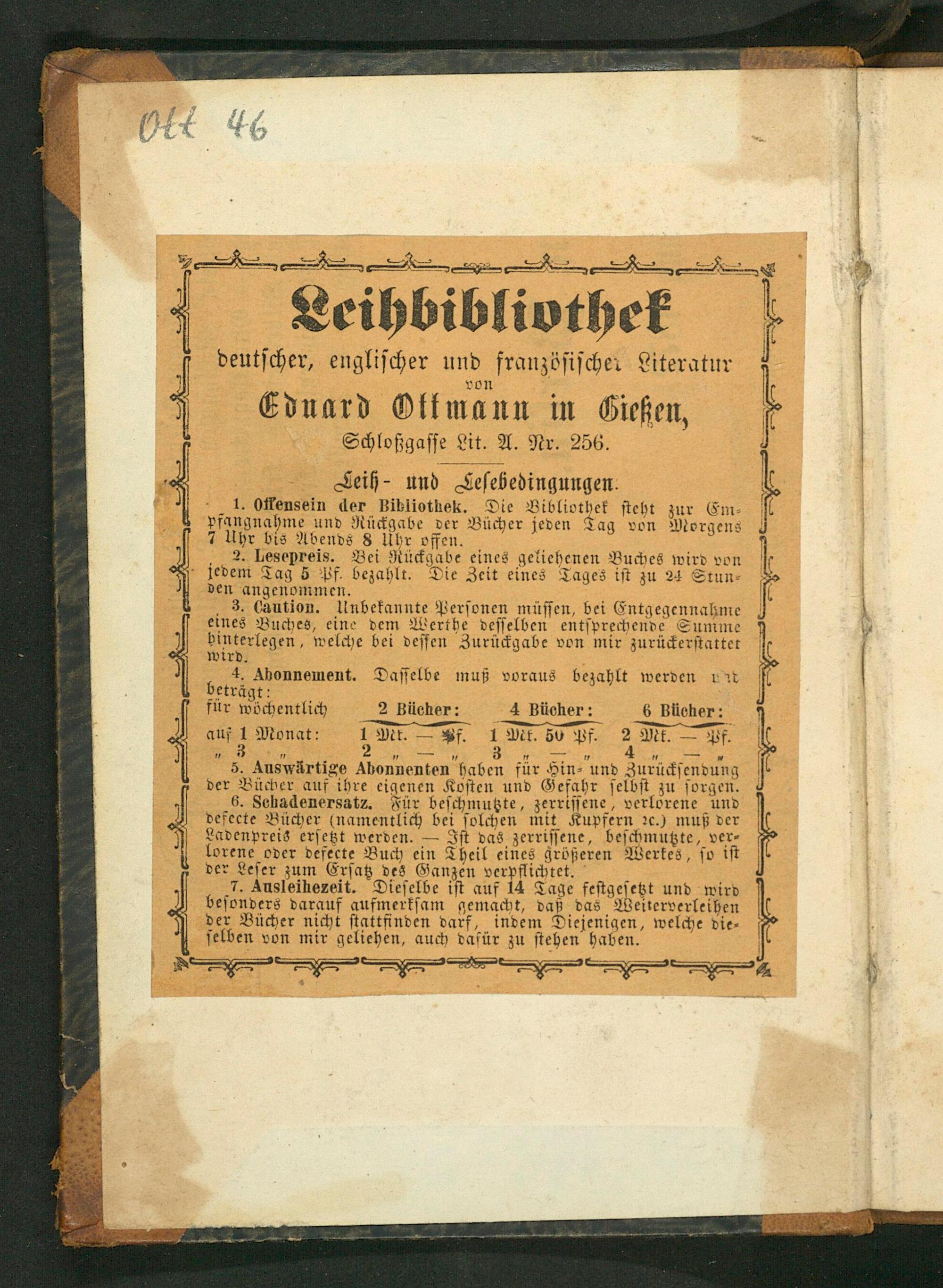 1. Oflensein der Bibliothek. Die Bibliothek ſteht zur Em— pfangnahme und Rückgabe der Bücher jeden Tag von Morgens 7 Uhr bis Abends 8 Uhr offen. 2. Lesepreis. Bei Rückgabe eines geliehenen Buches wird von jedem Tag 5 Pf bezahlt. Die Zeit eines Tages iſt zu 24 Stun⸗ den angenommen. 3. Caution. Unbekannte Perſonen müſſen, bei Entgegennahme eines Buches, eine dem Werthe deſſelben entſprechende Summe binterlegen, welche bei deſſen Zurückgabe von mir zurückerſtattet