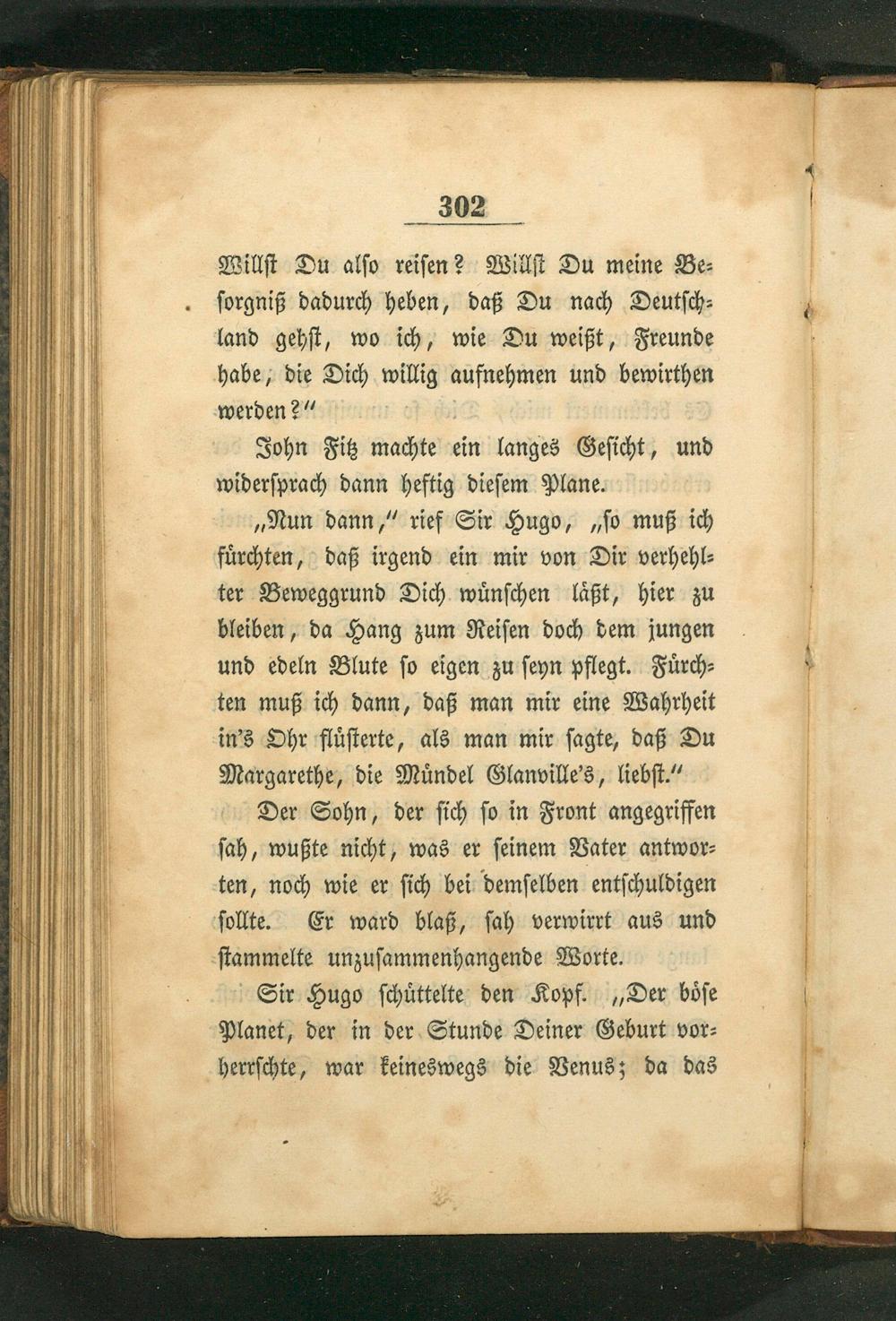 „Nun dann,“ rief Sir Hugo,„ſo muß ich fuͤrchten, daß irgend ein mir von Dir verhehl⸗ ter Beweggrund Dich wuͤnſchen laͤßt, hier zu bleiben, da Hang zum Reiſen doch dem jungen und edeln Blute ſo eigen zu ſeyn pflegt. Fuͤrch⸗ ten muß ich dann, daß man mir eine Wahrheit in's Ohr fluͤſterte, als man mir ſagte, daß Du Margarethe, die Muͤndel Glanville's, liebſt.“