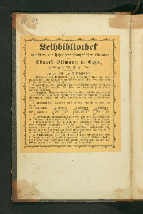 ———. cLeih, und geſebedingungen. offensein der Bibliothek. Die Bibliothek ſteht zur Em⸗ inhn und Rückgabe der Bücher jeden Tag von Morgens 7 Uhr bis Abends 8 Uhr offen. hesepreis. Bei Rückgabe eines geliehenen Buches wird von ſee Tag 5 Pf. bezahlt. Die Zeit eines Tages iſt zu 24 Stun⸗ den angenommen.