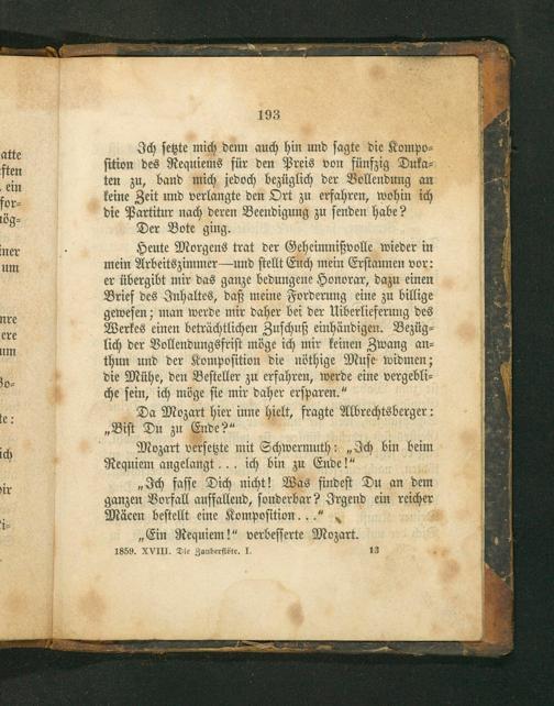 Ich ſetzte mich denn auch hin und ſagte die Kompo⸗ ſition des Requiems für den Preis von fünfzig Duka⸗ ten zu, band mich jedoch bezüglich der Vollendung an keine Zeit und verlangte den Ort zu erfahren, wohin ich die Partitur nach deren Beendigung zu ſenden habe?