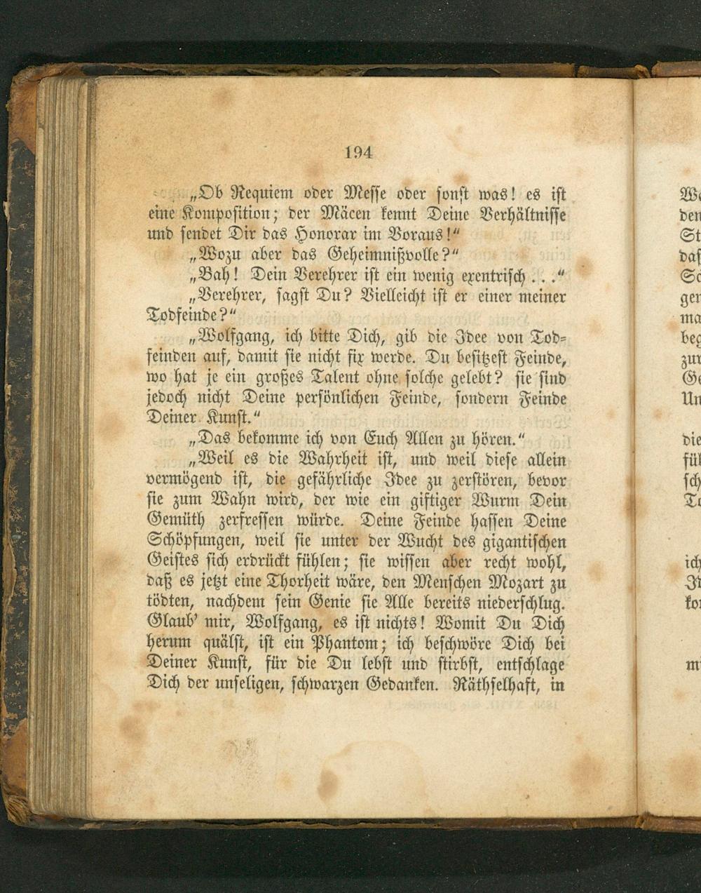 „Weil es die Wahrheit iſt, und weil dieſe allein vermögend iſt, die gefährliche Idee zu zerſtören, bevor ſie zum Wahn wird, der wie ein giftiger Wurm Dein Gemüth zerfreſſen würde. Deine Feinde haſſen Deine Schöpfungen, weil ſie unter der Wucht des gigantiſchen Geiſtes ſich erdrückt fühlen; ſie wiſſen aber recht wohl, daß es jetzt eine Thorheit wäre, den Menſchen Mozart zu tödten, nachdem ſein Genie ſie Alle bereits niederſchlug. Glaub' mir, Wolfgang, es iſt nichts! Womit Du Dich herum guälſt, iſt ein Phantom; ich beſchwöre Dich bei Deiner Kunſt, für die Du lebſt und ſtirbſt, entſchlage Dich der unſeligen, ſchwarzen Gedanken. Räthſelhaft, in