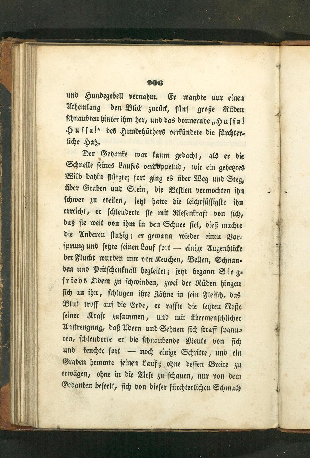 und Hundegebell vernahm. Er wandte nur einen Athemlang den Blick zurück, fünf große Rüden ſchnaubten hinter ihm her, und das donnernde Huſſa!