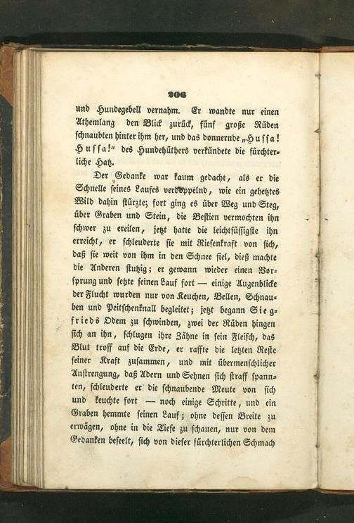 Der Gedanke war kaum gedacht, als er die Schnelle ſeines Laufes verdvppelnd, wie ein gehetztes Wild dahin ſtürzte; fort ging es über Weg und Steg, über Graben und Stein, die Beſtien vermochten ihn ſchwer zu ereilen, jetzt hatte die leichtfüſſigſte ihn erreicht, er ſchleuderte ſie mit Rieſenkraft von ſich, daß ſie weit von ihm in den Schnee fiel, dieß machte die Anderen ſtutzig; er gewann wieder einen Vor⸗ ſprung und ſetzte ſeinen Lauf fort— einige Augenblicke der Flucht wurden nur von Keuchen, Bellen, Schnau⸗ ben und Peitſchenknall begleitet; jetzt begann Sieg⸗ frieds Odem zu ſchwinden, zwei der Rüden hingen ſich an ihn, ſchlugen ihre Zähne in ſein Fleiſch, das Blut troff auf die Erde, er raffte die letzten Reſte ſeiner Kraft zuſammen, und mit übermenſchlicher Anſtrengung, daß Adern und Sehnen ſich ſtraff ſpann⸗