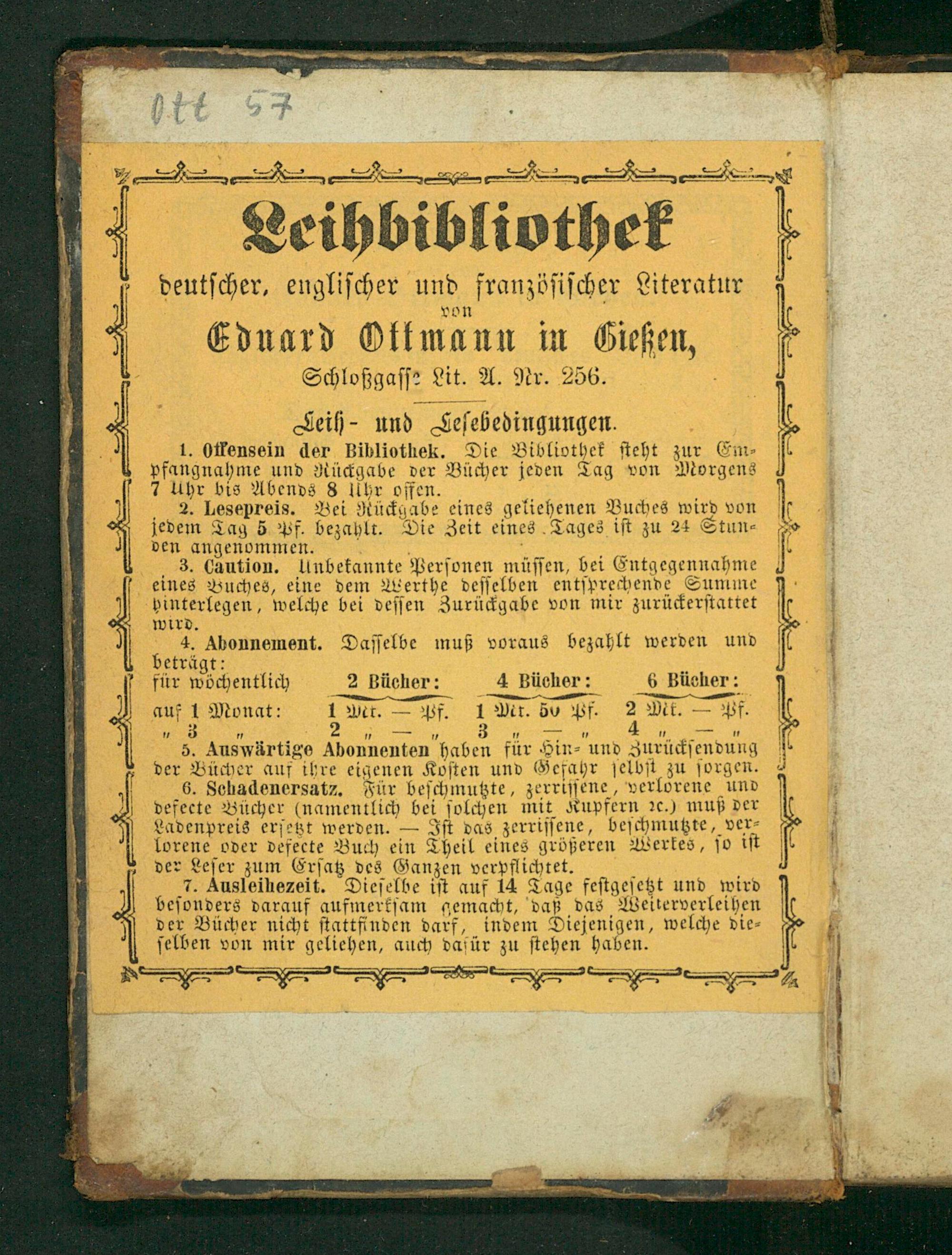 Ednard in Gießen, ſ Schloßgaſſ⸗ Lit. A. Nr. 256. Geih und 1. 1. Offensein der Bibliothek. Die Bibliothek ſteht zur Em⸗ jt pfangnahme und Rückgabe der Bücher jeden Tag von Morgens
