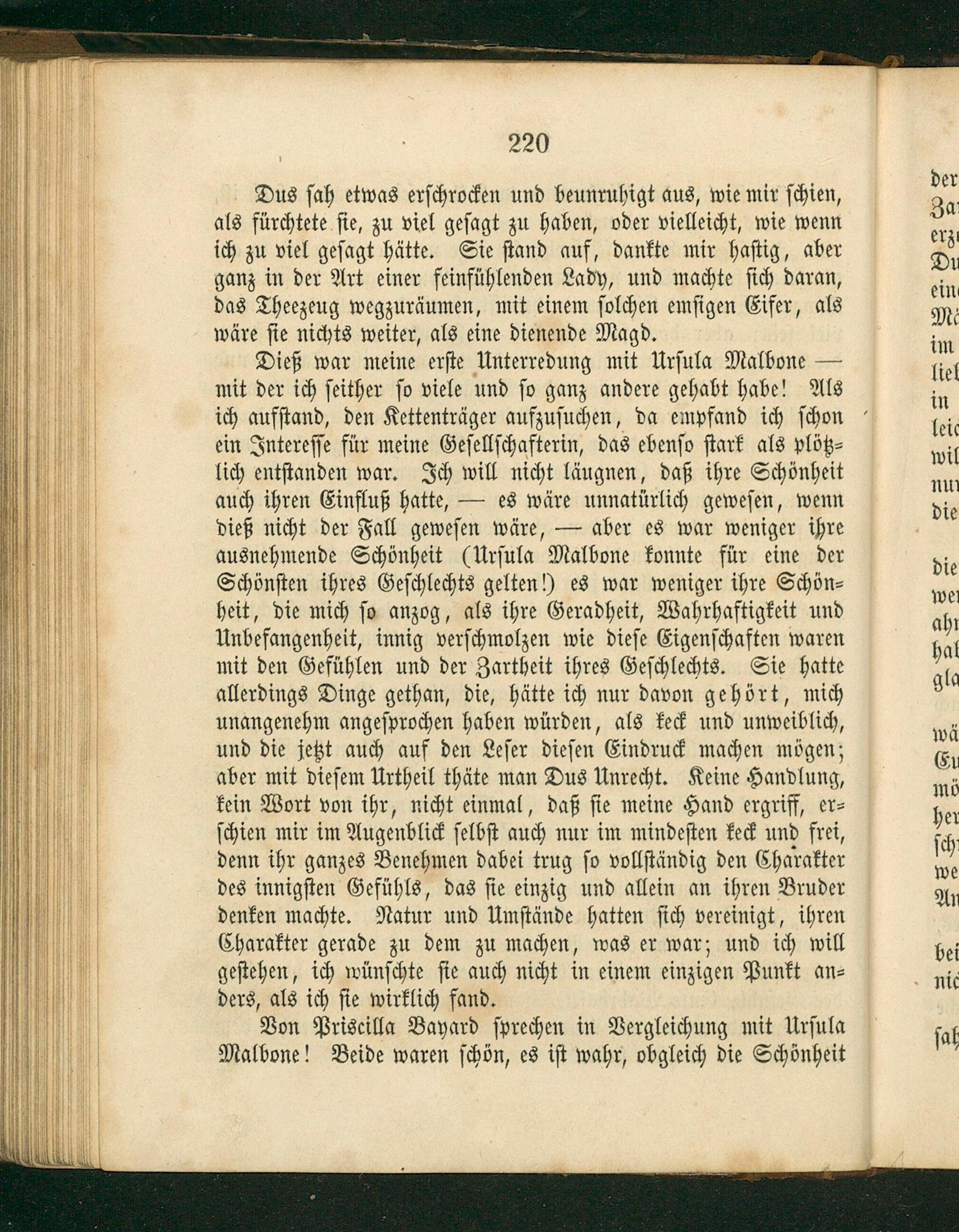 ein Intereſſe für meine Geſellſchafterin, das ebenſo ſtark als plötz⸗ lich entſtanden war. Ich will nicht läugnen, daß ihre Schönheit auch ihren Einfluß hatte,— es wäre unnatürlich geweſen, wenn dieß nicht der Fall geweſen wäre,— aber es war weniger ihre ausnehmende Schönheit(Urſula Malbone konnte für eine der Schönſten ihres Geſchlechts gelten!) es war weniger ihre Schön⸗ heit, die mich ſo anzog, als ihre Geradheit, Wahrhaftigkeit und Unbefangenheit, innig verſchmolzen wie dieſe Eigenſchaften waren mit den Gefühlen und der Zartheit ihres Geſchlechts. Sie hatte allerdings Dinge gethan, die, hätte ich nur davon gehört, mich unangenehm angeſprochen haben würden, als keck und unweiblich, und die jetzt auch auf den Leſer dieſen Eindruck machen mögen; aber mit dieſem Urtheil thäte man Dus Unrecht. Keine Handlung, kein Wort von ihr, nicht einmal, daß ſie meine Hand ergriff, er⸗ ſchien mir im Augenblick ſelbſt auch nur im mindeſten keck und frei, denn ihr ganzes Benehmen dabei trug ſo vollſtändig den Charakter des innigſten Gefühls, das ſie einzig und allein an ihren Bruder denken machte. Natur und Umſtände hatten ſich vereinigt, ihren Charakter gerade zu dem zu machen, was er war; und ich will geſtehen, ich wünſchte ſie auch nicht in einem einzigen Punkt an⸗ ders, als ich ſie wirklich fand.