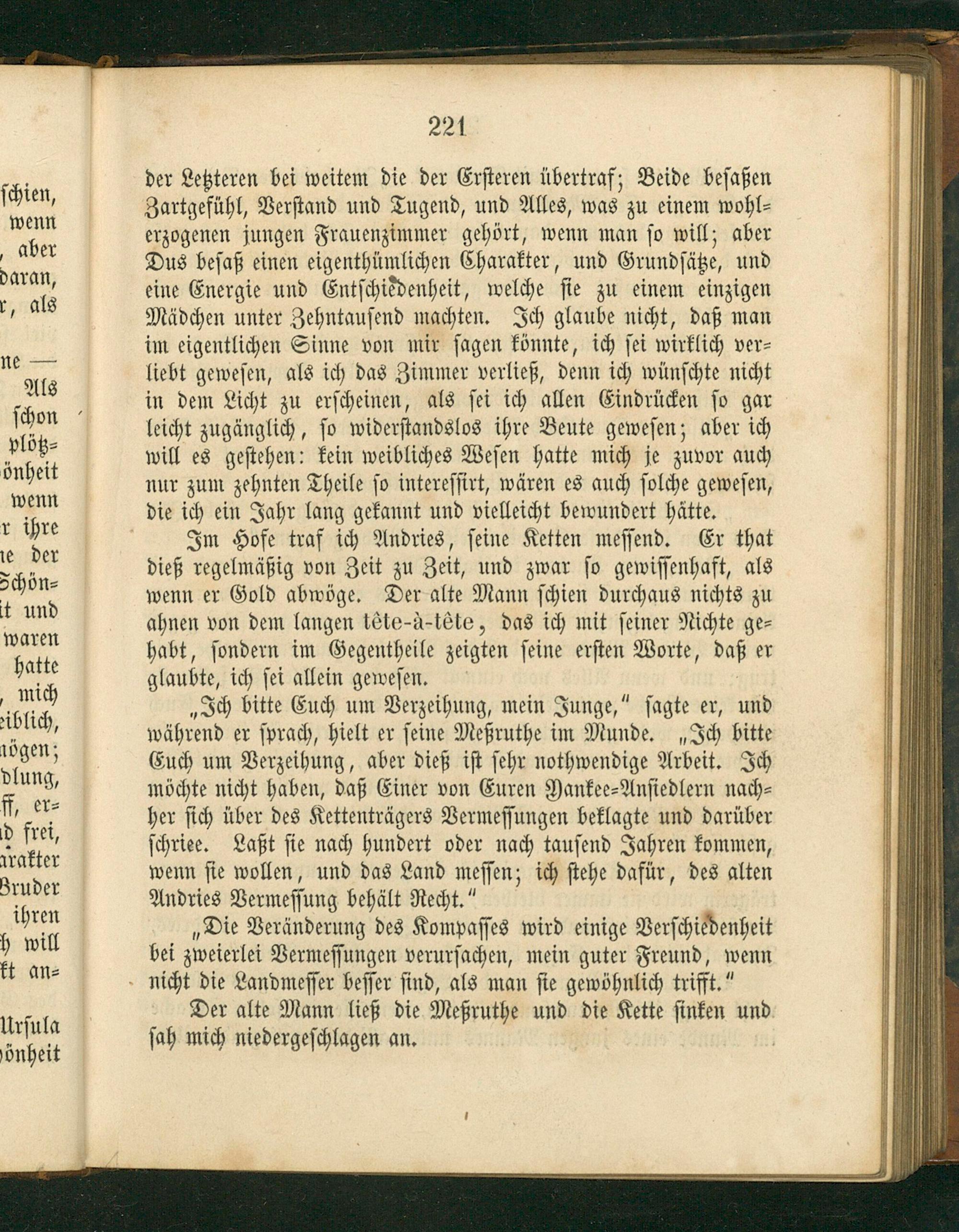 „Ich bitte Euch um Verzeihung, mein Junge,“ ſagte er, und während er ſprach, hielt er ſeine Meßruthe im Munde.„Ich bitte Euch um Verzeihung, aber dieß iſt ſehr nothwendige Arbeit. Ich möchte nicht haben, daß Einer von Euren Yankee⸗Anſiedlern nach⸗ her ſich über des Kettenträgers Vermeſſungen beklagte und darüber ſchriee. Laßt ſie nach hundert oder nach tauſend Jahren kommen, wenn ſie wollen, und das Land meſſen; ich ſtehe dafür, des alten Andries Vermeſſung behält Recht.“