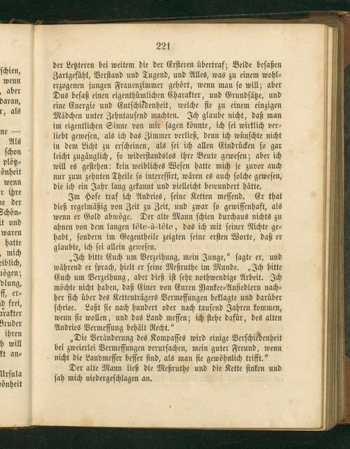 Im Hofe traf ich Andries, ſeine Ketten meſſend. Er that dieß regelmäßig von Zeit zu Zeit, und zwar ſo gewiſſenhaft, als wenn er Gold abwöge. Der alte Mann ſchien durchaus nichts zu ahnen von dem langen téte-à-téte, das ich mit ſeiner Nichte ge⸗ habt, ſondern im Gegentheile zeigten ſeine erſten Worte, daß er glaubte, ich ſei allein geweſen.