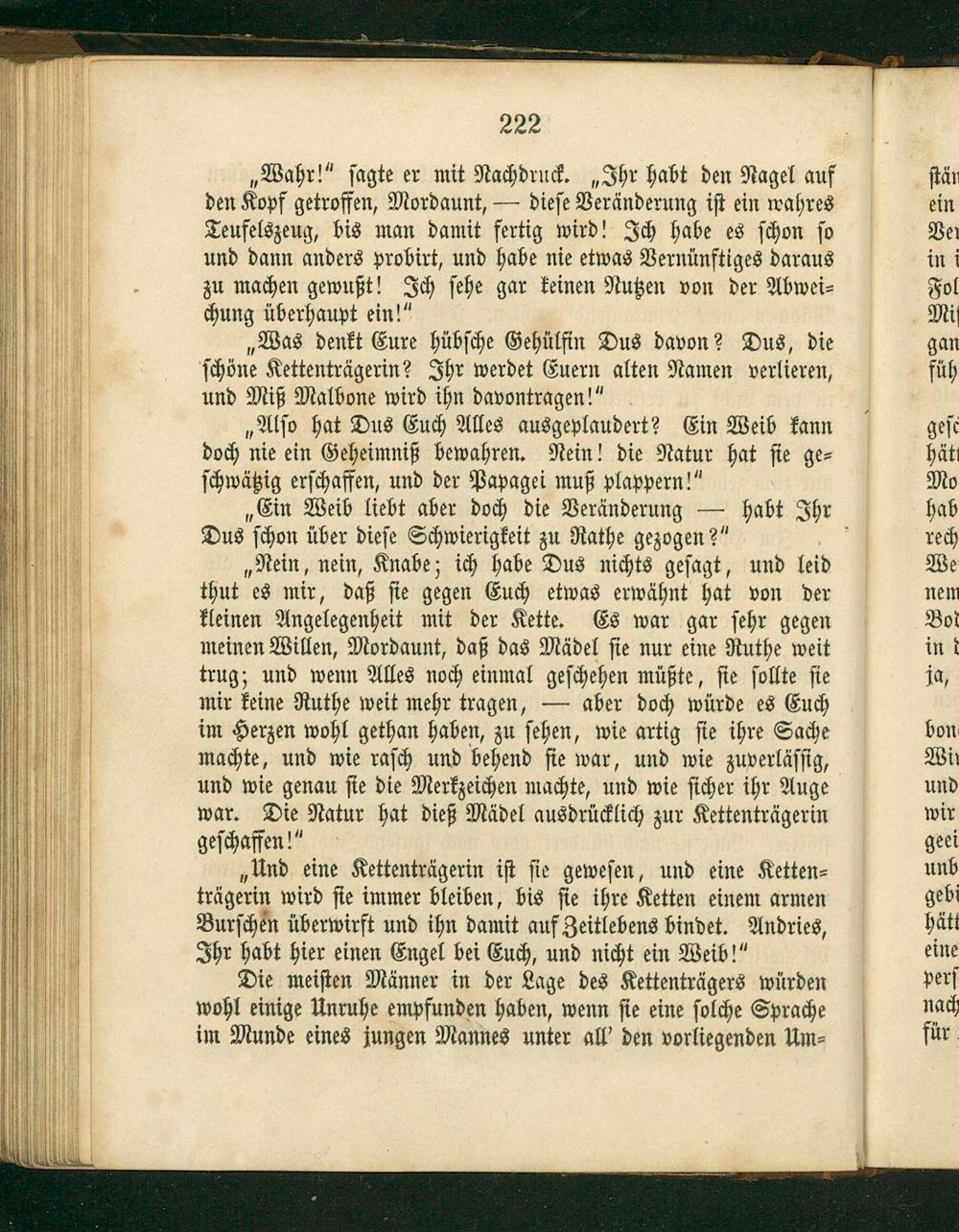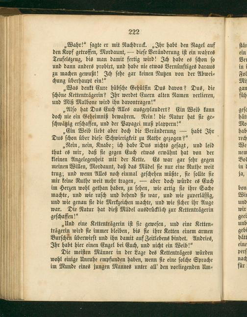 „Alſo hat Dus Euch Alles ausgeplaudert? Ein Weib kann doch nie ein Geheimniß bewahren. Nein! die Natur hat ſie ge⸗ ſchwätzig erſchaffen, und der Papagei muß plappern!“