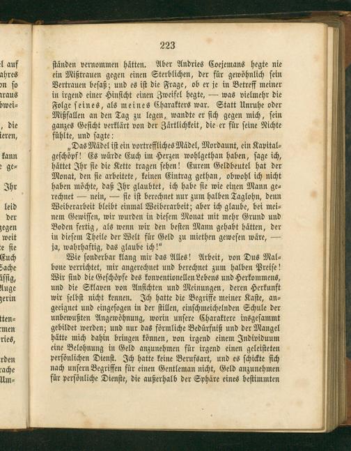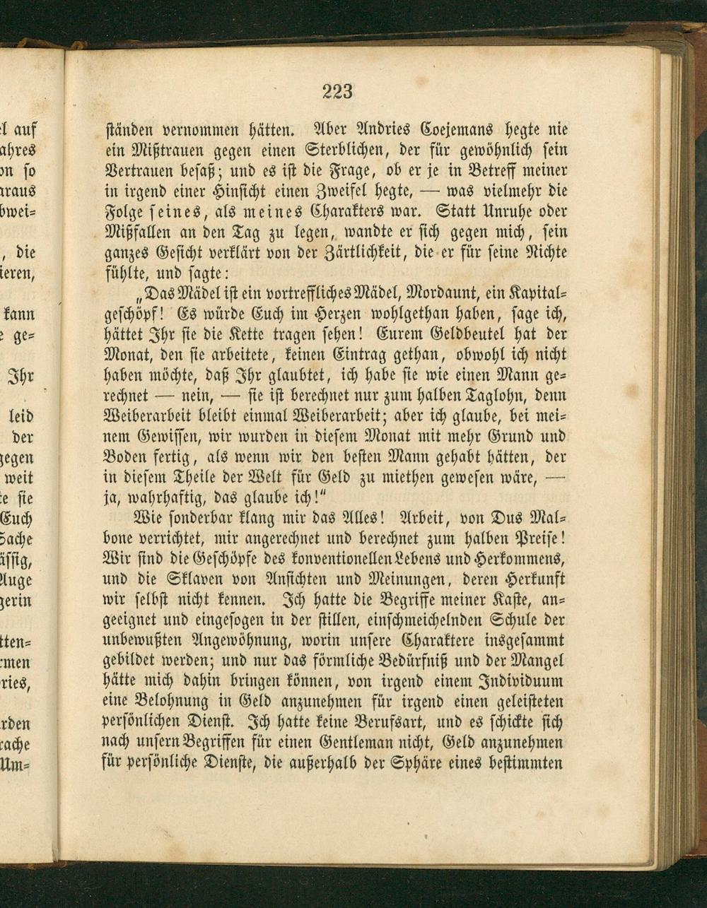 Wie ſonderbar klang mir das Alles! Arbeit, von Dus Mal⸗ bone verrichtet, mir angerechnet und berechnet zum halben Preiſe! Wir ſind die Geſchöpfe des konventionellen Lebens und Herkommens, und die Sklaven von Anſichten und Meinungen, deren Herkunft wir ſelbſt nicht kennen. Ich hatte die Begriffe meiner Kaſte, an⸗ geeignet und eingeſogen in der ſtillen, einſchmeichelnden Schule der unbewußten Angewöhnung, worin unſere Charaktere insgeſammt gebildet werden; und nur das förmliche Bedürfniß und der Mangel hätte mich dahin bringen können, von irgend einem Individuum eine Belohnung in Geld anzunehmen für irgend einen geleiſteten perſönlichen Dienſt. Ich hatte keine Berufsart, und es ſchickte ſich nach unſern Begriffen für einen Gentleman nicht, Geld anzunehmen für perſönliche Dienſte, die außerhalb der Sphäre eines beſtimmten