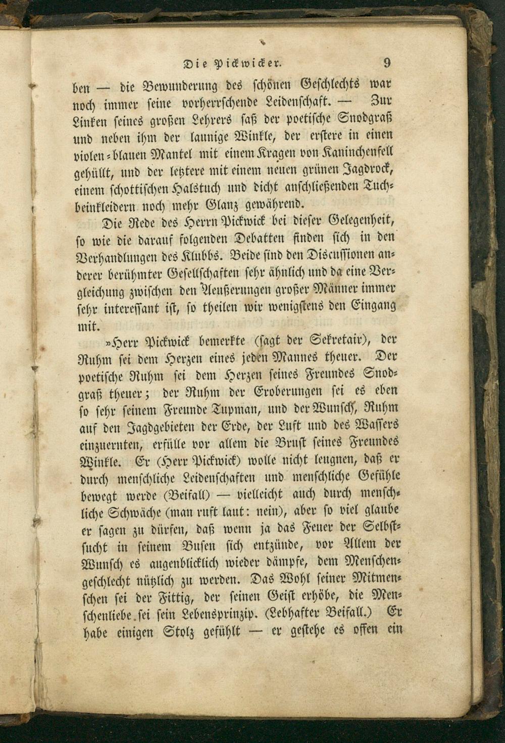 „»Herr Pickwick bemerkte(ſagt der Sekretair), der Ruhm ſei dem Herzen eines jeden Mannes theuer. Der poetiſche Ruhm ſei dem Herzen ſeines Freundes Snod⸗ graß theuer; der Ruhm der Eroberungen ſei es eben ſo ſehr ſeinem Freunde Tupman, und der Wunſch, Ruhm auf den Jagdgebieten der Erde, der Luft und des Waſſers einzuernten, erfülle vor allem die Bruſt ſeines Freundes Winkle. Er(Herr Pickwick) wolle nicht leugnen, daß er