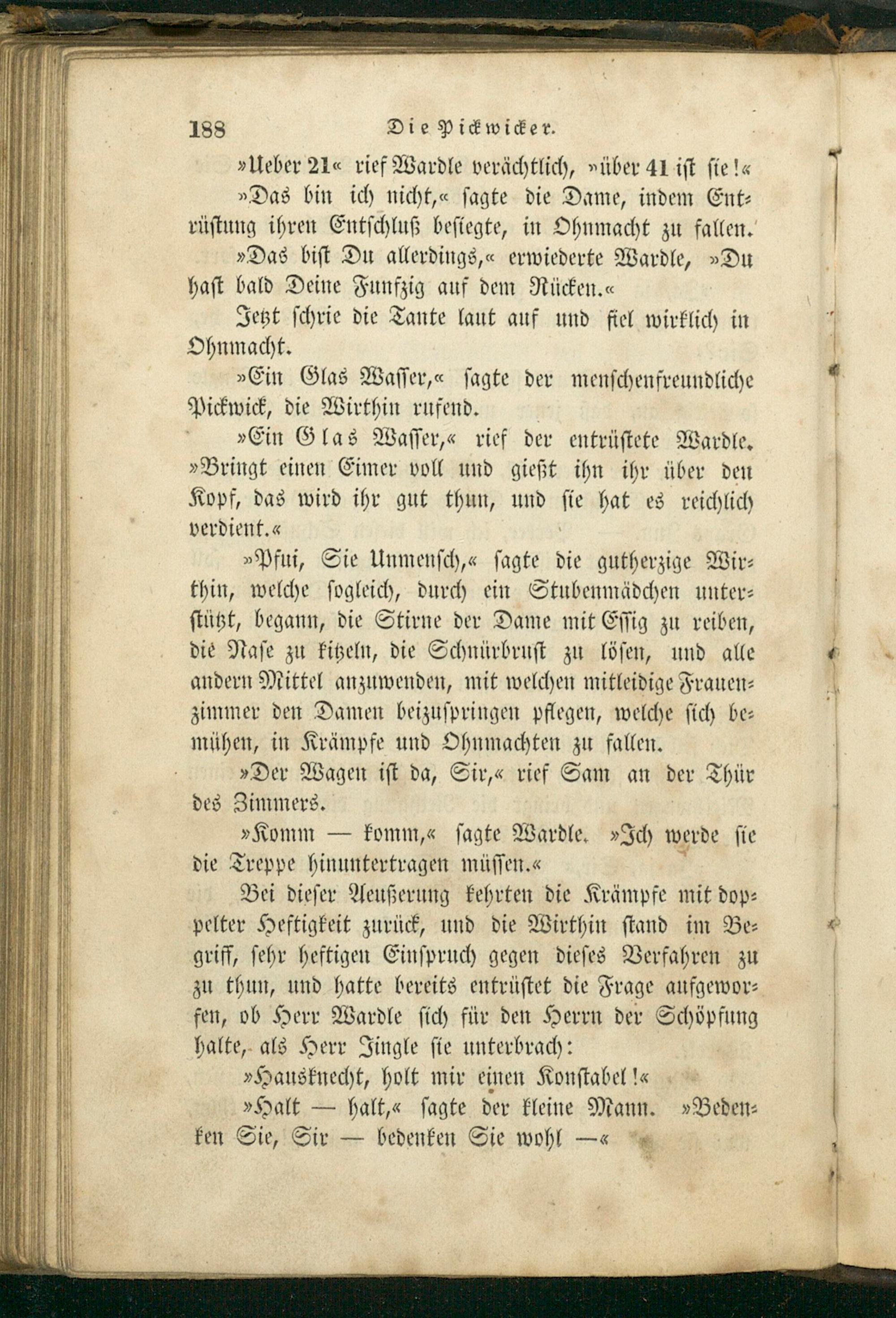 Bei dieſer Aeußerung kehrten die Krämpfe mit dop⸗ pelter Heftigkeit zurück, und die Wirthin ſtand im Be⸗ griff, ſehr heftigen Einſpruch gegen dieſes Verfahren zu zu thun, und hatte bereits entrüſtet die Frage aufgewor⸗ fen, ob Herr Wardle ſich für den Herrn der Schöpfung halte, als Herr Jingle ſie unterbrach: