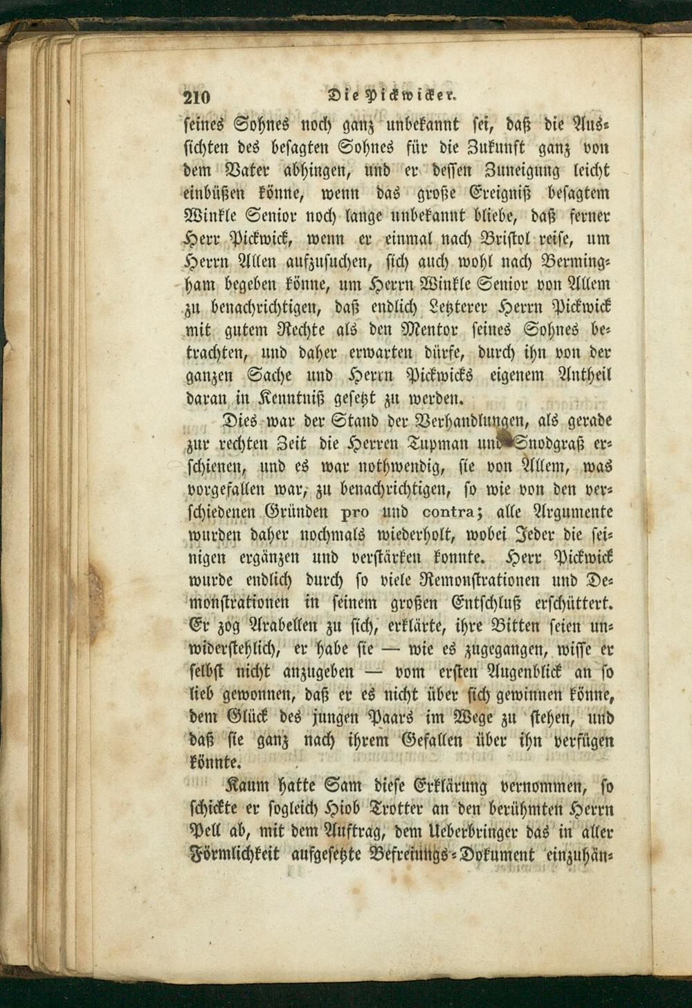 ſichten des beſagten Sohnes für die Zukunft ganz von dem Vater abhingen, und er deſſen Zuneigung leicht einbüßen könne, wenn das große Ereigniß beſagtem Winkle Senior noch lange unbekannt bliebe, daß ferner Herr Pickwick, wenn er einmal nach Briſtol reiſe, um Herrn Allen aufzuſuchen, ſich auch wohl nach Berming⸗ ham begeben könne, um Herrn Winkle Senior von Allem
