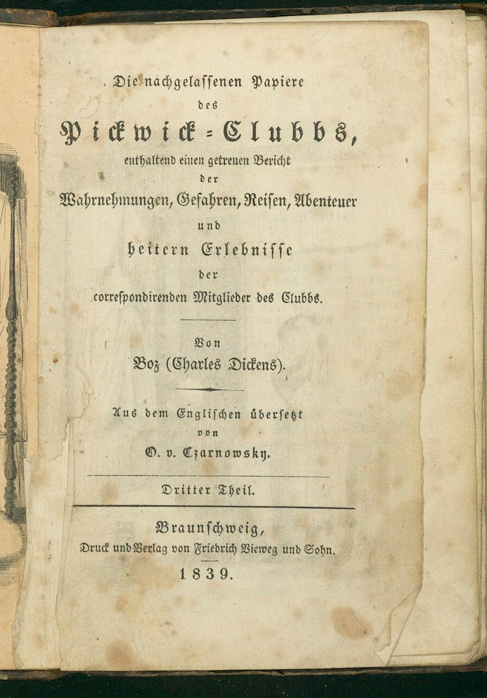 Pickwick⸗Clubbs, enthaltend einen getreuen Bericht 4 der Wahrnehmungen, Gefahren, Reiſen, Abenteuer und heitern Erlebniſſe der correſpondirenden Mitglieder des Clubbs. 1 Von Boz(Charles Dickens).