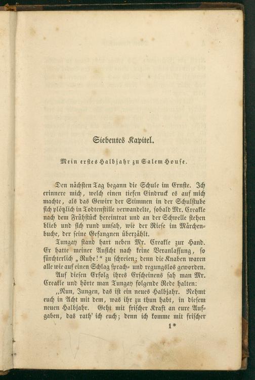 Den naͤchſten Tag begann die Schule im Ernſte. Ich erinnere mich, welch einen tiefen Eindruck es auf mich machte, als das Gewirr der Stimmen in der Schulſtube ſich plötzlich in Todtenſtille verwandelte, ſobald Mr. Creakle nach dem Frühſtück hereintrat und an der Schwelle ſtehen blieb und ſich rund umſah, wie der Rieſe im Märchen⸗ buche, der ſeine Gefangnen überzählt.