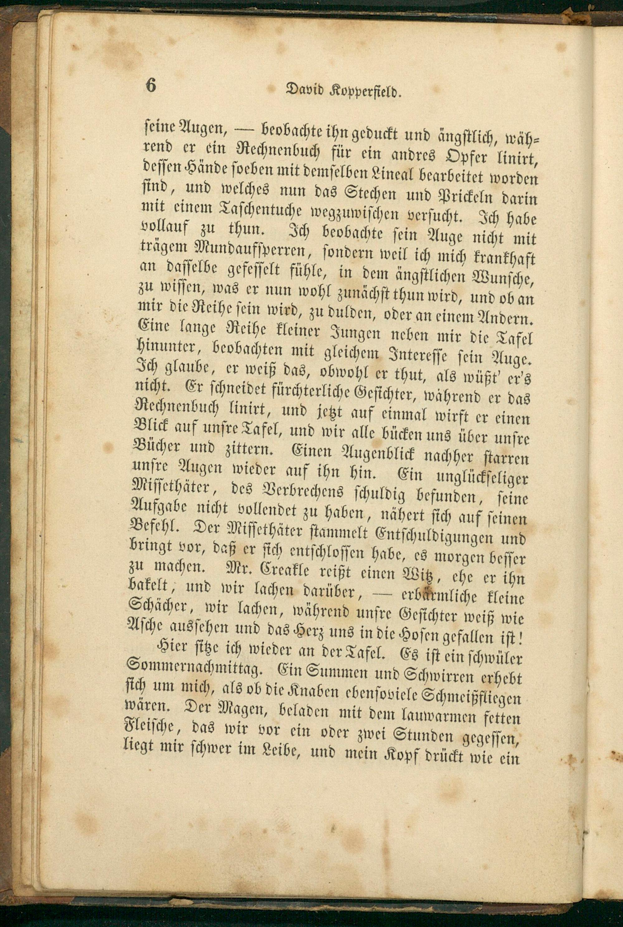 ſeine Augen,— beobachte ihn geduckt und ängſtlich, rend er ein Rechnenbuch für ein andres Opfer linirt, deſſen Hände ſoeben mit demſelben Lineal bearbeitet worden ſind, und welches nun das Stechen und Prickeln darin mit einem Taſchentuche wegzuwiſchen verſucht. Ich habe vollauf zu thun. Ich beobachte ſein Auge nicht mit trägem Mundaufſperren, ſondern weil ich mich krankhaft an daſſelbe gefeſſelt fühle, in dem ängſtlichen Wunſche, zu wiſſen, was er nun wohl zunächſt thun wird, und ob an mir die Reihe ſein wird, zu dulden, oder an einem Andern. Eine lange Reihe kleiner Jungen neben mir die Tafel hinunter, beobachten mit gleichem Intereſſe ſein Auge. Ich glaube, er weiß das, obwohl er thut, als wüßt' er's nicht. Er ſchneidet fürchterliche Geſichter, während er das Rechnenbuch linirt, und jetzt auf einmal wirft er einen Blick auf unſre Tafel, und wir alle bücken uns über unſre Bücher und zittern. Einen Augenblick nachher ſtarren unſre Augen wieder auf ihn hin. Ein unglückſeliger Miſſethäter, des Verbrechens ſchuldig befunden, ſeine Aufgabe nicht vollendet zu haben, nähert ſich auf ſeinen Befehl. Der Miſſethäter ſtammelt Entſchuldigungen und bringt vor, daß er ſich entſchloſſen habe, es morgen beſſer zu machen. Mr. Creakle reißt einen Wi„ehe er ihn bakelt, und wir lachen darüber,— erb mliche kleine Schächer, wir lachen, während unſre Geſichter weiß wie Aſche ausſehen und das Herz uns in die Hoſen gefallen iſt! Hier ſitze ich wieder an der Tafel. Es iſt ein ſchwüler Sommernachmittag. Ein Summen und Schwirren erhebt ſich um mich, als ob die Knaben ebenſoviele Schmeißfliegen wären. Der Magen, beladen mit dem lauwarmen fetten Fleiſche, das wir vor ein oder zwei Stunden gegeſſen, liegt mir ſchwer im Leibe, und mein Kopf drückt wie ein