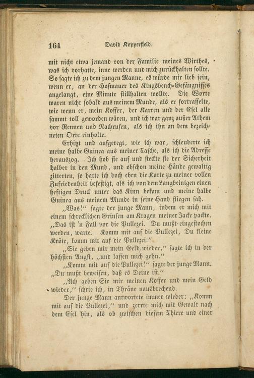 Der junge Mann antwortete immer wieder:„Komm mit auf die Pullezei,“ und zerrte mich mit Gewalt nach dem Eſel hin, als ob zwiſchen dieſem Thiere und einer