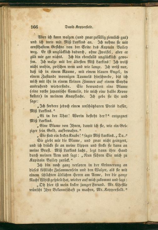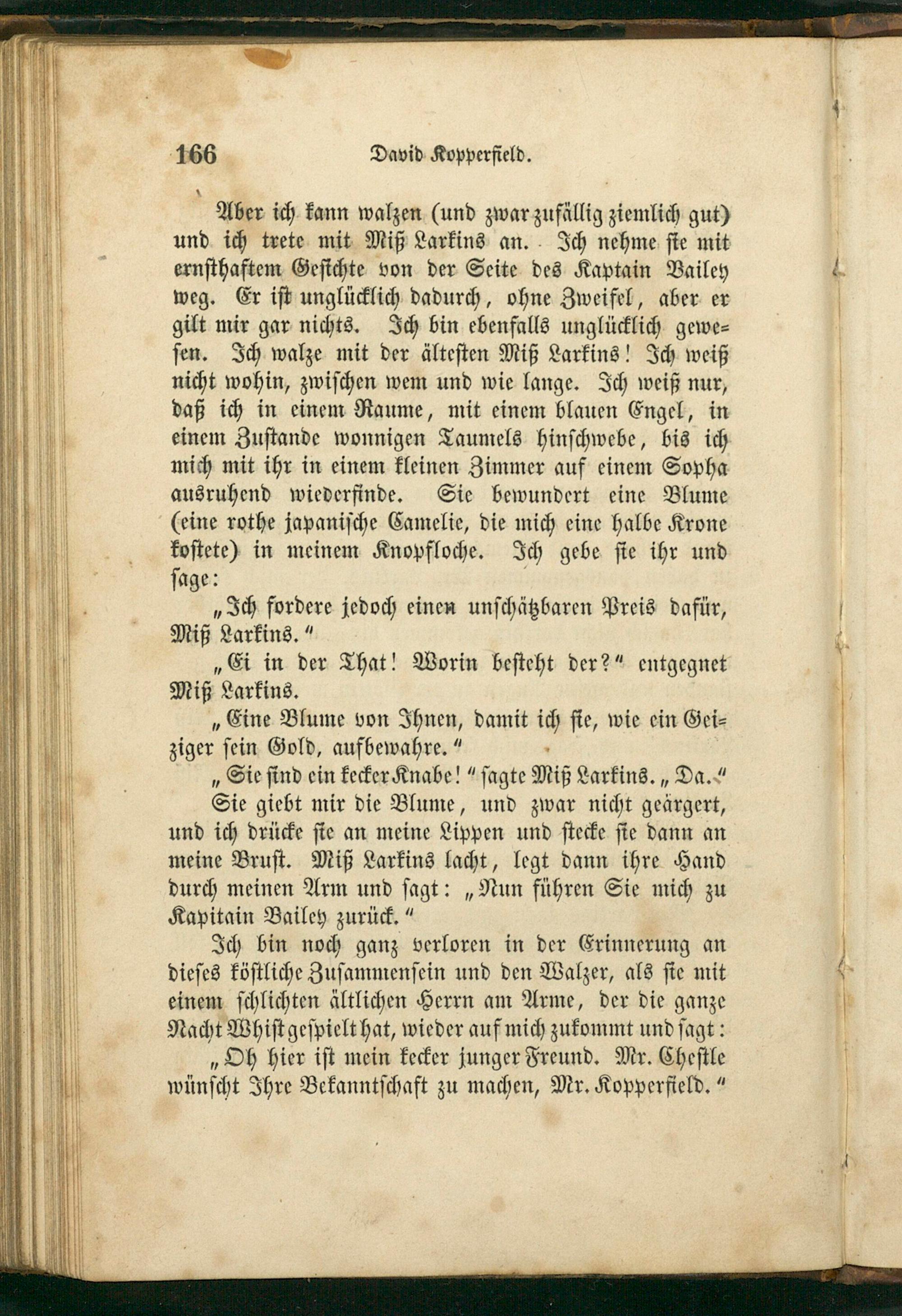 Aber ich kann walzen(und zwar zufällig ziemlich gut) und ich trete mit Miß Larkins an. Ich nehme ſte mit ernſthaftem Geſichte von der Seite des Kaptain Vailey weg. Er iſt unglücklich dadurch, ohne Zweifel, aber er gilt mir gar nichts. Ich bin ebenfalls unglücklich gewe⸗ ſen. Ich walze mit der älteſten Miß Larkins! Ich weiß nicht wohin, zwiſchen wem und wie lange. Ich weiß nur, daß ich in einem Raume, mit einem blauen Engel, in einem Zuſtande wonnigen Taumels hinſchwebe, bis ich mich mit ihr in einem kleinen Zimmer auf einem Sopha ausruhend wiederfinde. Sie bewundert eine Blume (eine rothe japaniſche Camelie, die mich eine halbe Krone koſtete) in meinem Knopfloche. Ich gebe ſie ihr und ſage: