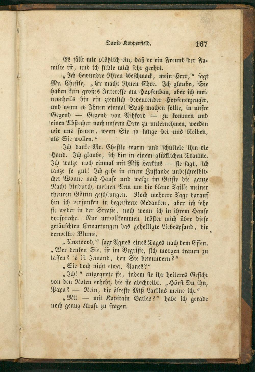 „Trotwood,“ ſagt Agnes eines Tages nach dem Eſſen. „Wer denken Sie, iſt im Begriffe, ſich morgen trauen zu laſſen?'s iſt Jemand, den Sie bewundern?“