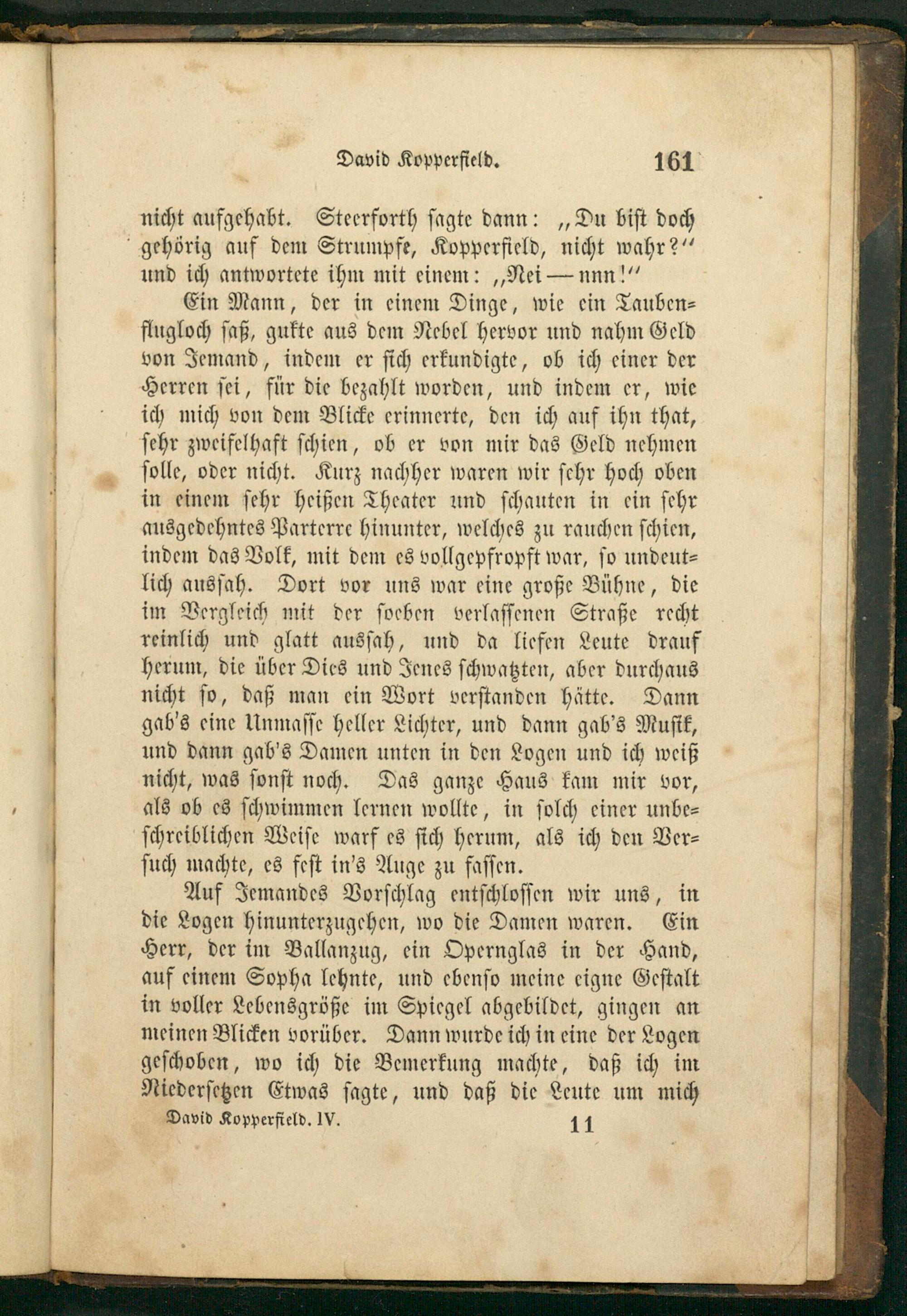 Ein Mann, der in einem Dinge, wie ein Tauben⸗ flugloch ſaß, gukte aus dem Nebel hervor und nahm Geld von Jemand, indem er ſich erkundigte, ob ich einer der Herren ſei, für die bezahlt worden, und indem er, wie ich mich von dem Blicke erinnerte, den ich auf ihn that, ſehr zweifelhaft ſchien, ob er von mir das Geld nehmen ſolle, oder nicht. Kurz nachher waren wir ſehr hoch oben in einem ſehr heißen Theater und ſchauten in ein ſehr ausgedehntes Parterre hinunter, welches zu rauchen ſchien, indem das Volk, mit dem es vollgepfropft war, ſo undeut⸗ lich ausſah. Dort vor uns war eine große Bühne, die im Vergleich mit der ſoeben verlaſſenen Straße recht reinlich und glatt ausſah, und da liefen Leute drauf herum, die über Dics und Jenes ſchwatzten, aber durchaus nicht ſo, daß man ein Wort verſtanden hätte. Dann gab's eine Unmaſſe heller Lichter, und dann gab's Muſik, und dann gab's Damen unten in den Logen und ich weiß nicht, was ſonſt noch. Das ganze Haus kam mir vor, als ob es ſchwimmen lernen wollte, in ſolch einer unbe⸗ ſchreiblichen Weiſe warf es ſich herum, als ich den Ver⸗ ſuch machte, es feſt in's Auge zu faſſen.