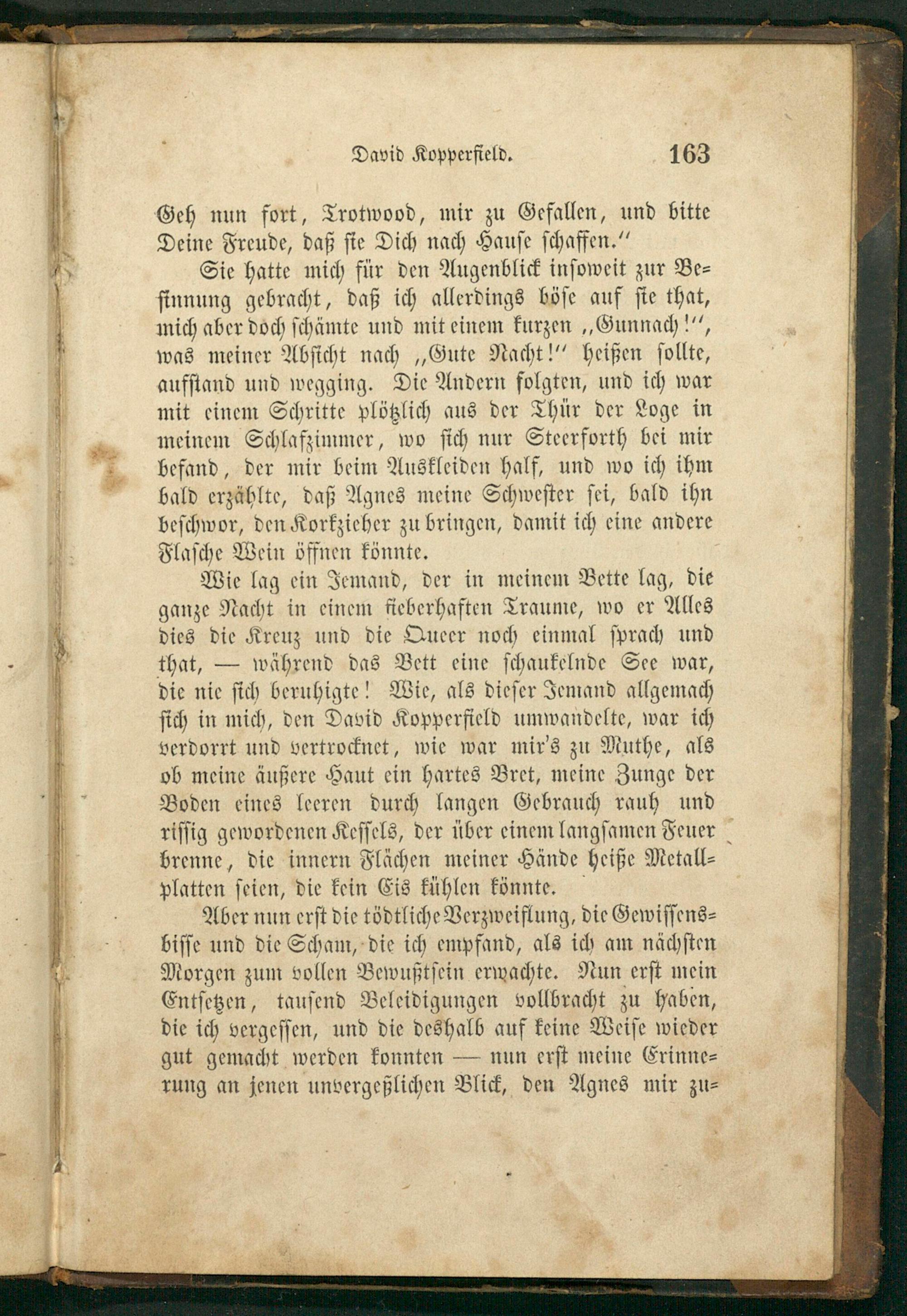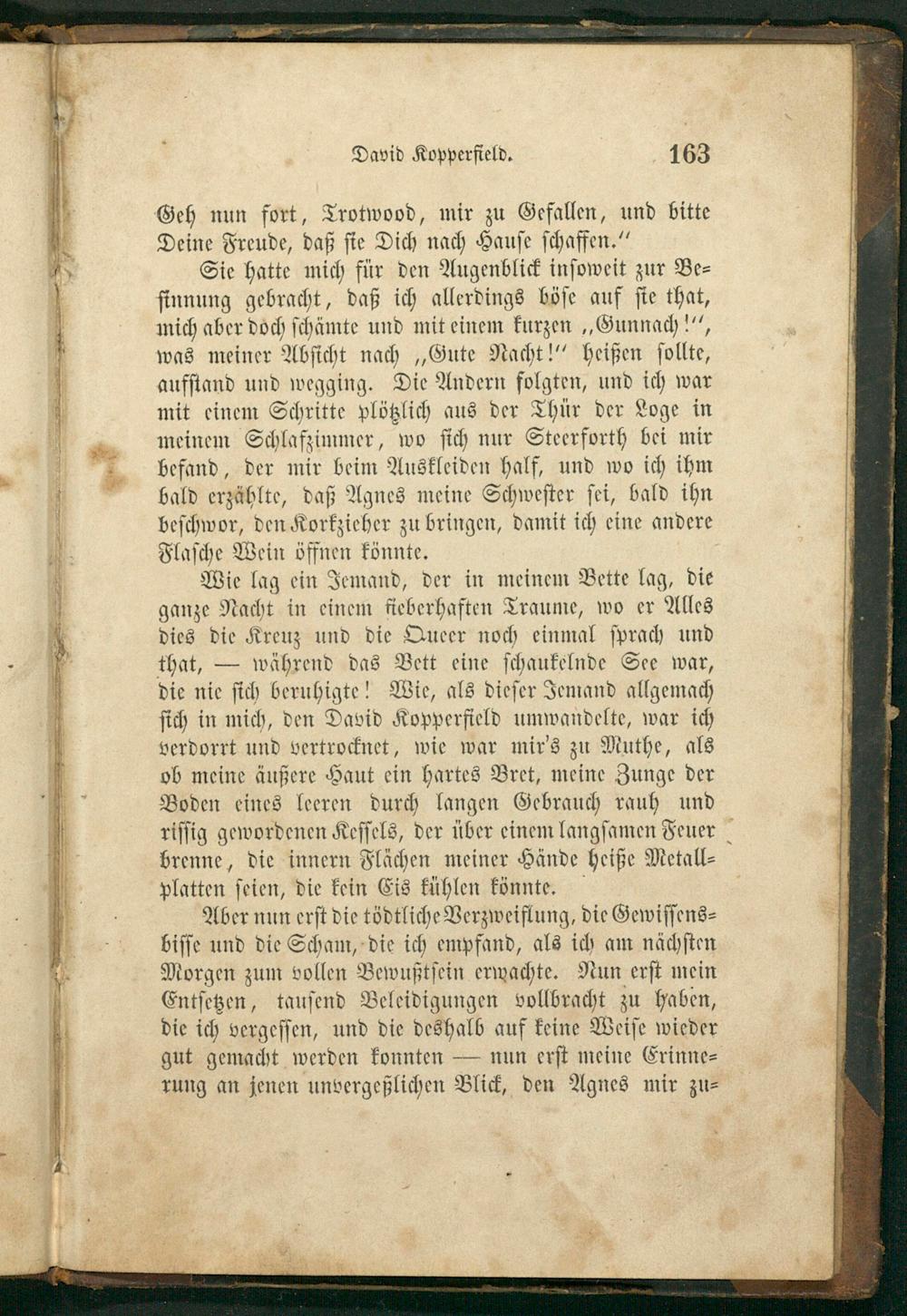 Sie hatte mich für den Augenblick inſoweit zur Be⸗ ſinnung gebracht, daß ich allerdings böſe auf ſie that, mich aber doch ſchämte und mit einem kurzen„Gunnach!“, was meiner Abſicht nach„Gute Nacht!“ heißen ſollte, aufſtand und wegging. Die Andern folgten, und ich war mit einem Schritte plötzlich aus der Thür der Loge in meinem Schlafzimmer, wo ſich nur Steerforth bei mir befand, der mir beim Auskleiden half, und wo ich ihm bald erzählte, daß Agnes meine Schweſter ſei, bald ihn beſchwor, den Korkzieher zu bringen, damit ich eine andere Flaſche Wein öffnen könnte.