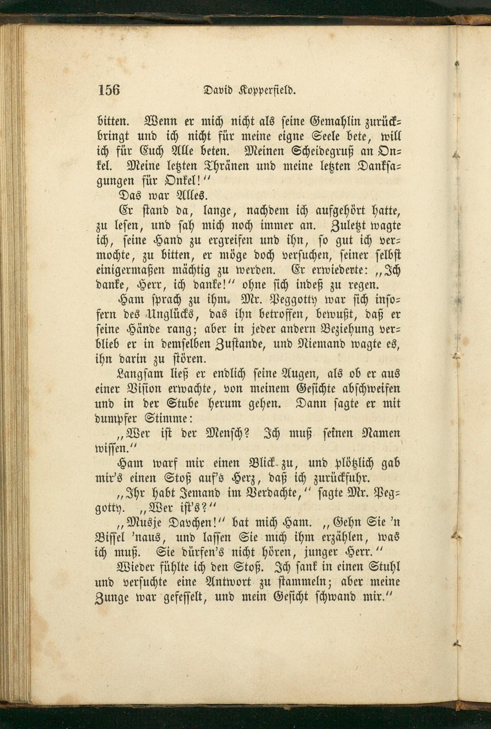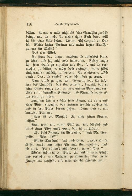 Ham ſprach zu ihm. Mr. Peggotty war ſich inſo⸗ fern des Unglücks, das ihn betroffen, bewußt, daß er ſeine Hände rang; aber in jeder andern Beziehung ver⸗ blieb er in demſelben Zuſtande, und Niemand wagte es, ihn darin zu ſtören.