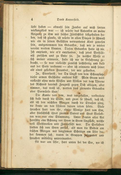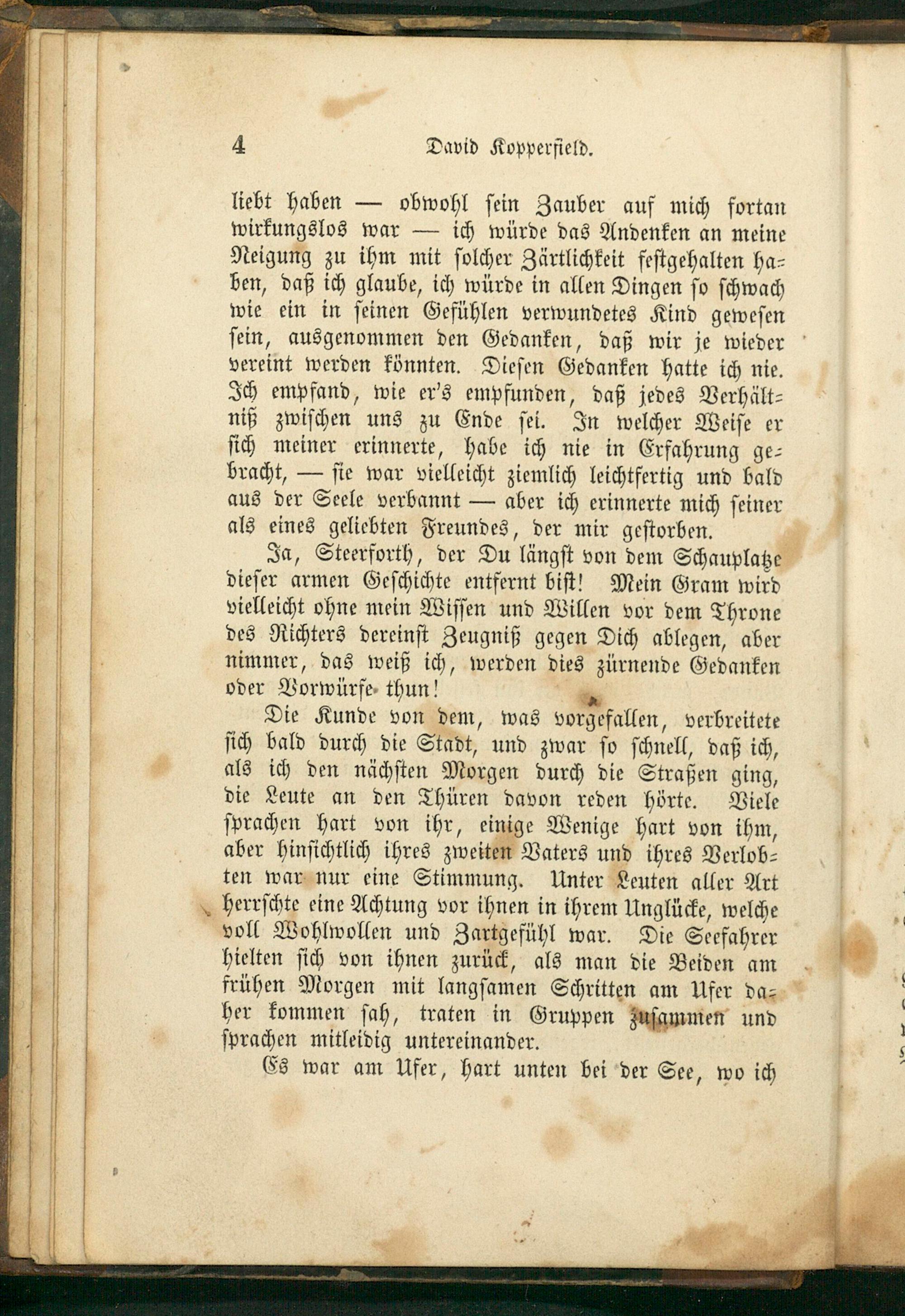 Ja, Steerforth, der Du längſt von dem Schauplatze dieſer armen Geſchichte entfernt biſt! Mein Gram wird vielleicht ohne mein Wiſſen und Willen vor dem Throne des Richters dereinſt Zeugniß gegen Dich ablegen, aber nimmer, das weiß ich, werden dies zürnende Gedanken oder Vorwürfe thun!