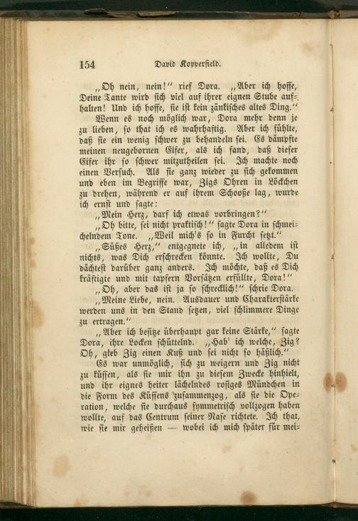 Wenn es noch möglich war, Dora mehr denn je zu lieben, ſo that ich es wahrhaftig. Aber ich fühlte, daß ſie ein wenig ſchwer zu behandeln ſei. Es dämpfte meinen neugebornen Eifer, als ich fand, daß dieſer Eifer ihr ſo ſchwer mitzutheilen ſei. Ich machte noch einen Verſuch. Als ſie ganz wieder zu ſich gekommen und eben im Begriffe war, Zigs Ohren in Löckchen zu drehen, während er auf ihrem Schooße lag, wurde ich ernſt und ſagte: