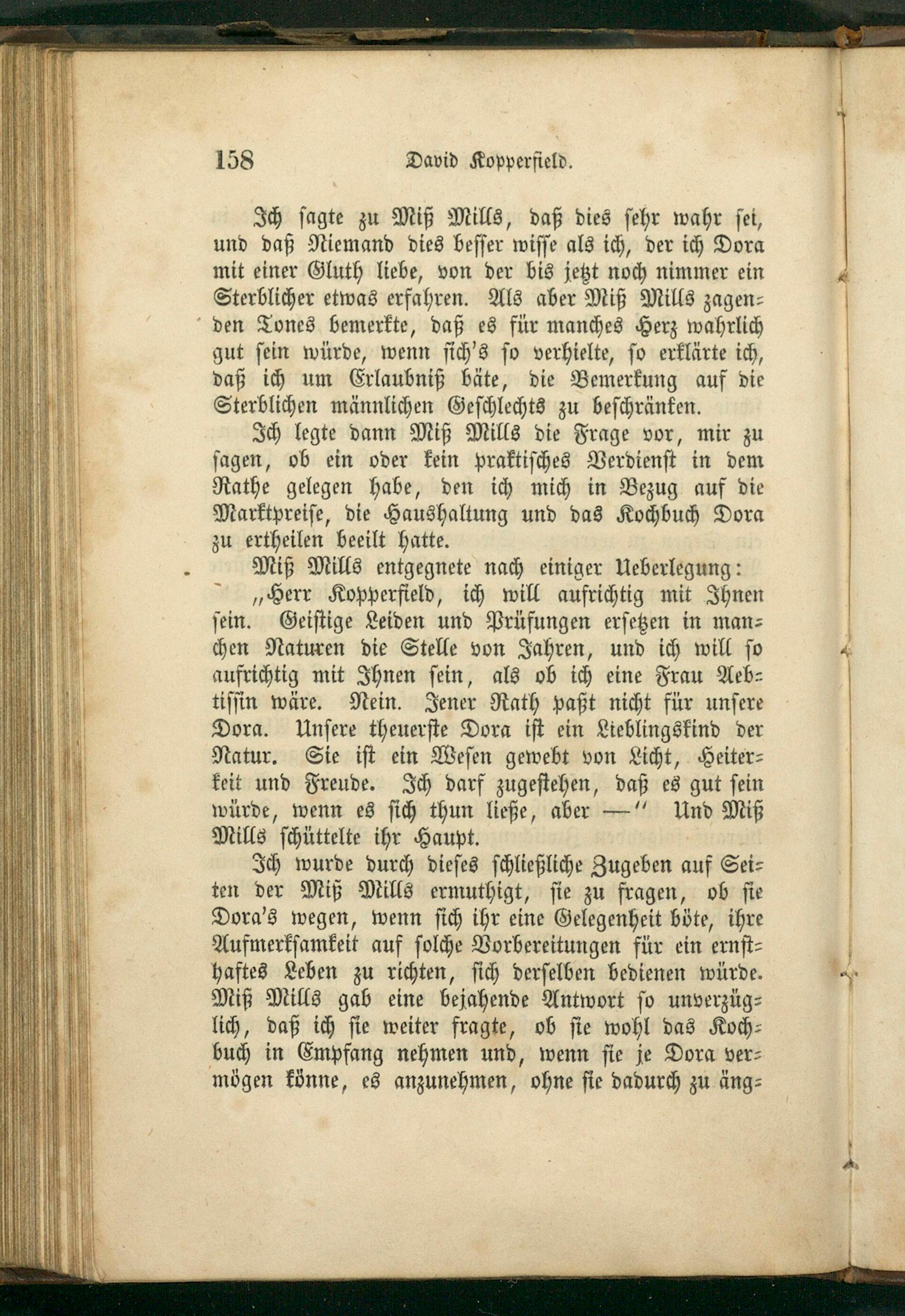 Ich wurde durch dieſes ſchließliche Zugeben auf Sei⸗ ten der Miß Mills ermuthigt, ſie zu fragen, ob ſie Dora's wegen, wenn ſich ihr eine Gelegenheit böte, ihre Aufmerkſamkeit auf ſolche Vorbereitungen für ein ernſt⸗ haftes Leben zu richten, ſich derſelben bedienen würde. Miß Mills gab eine bejahende Antwort ſo unverzüg⸗ lich, daß ich ſie weiter fragte, ob ſie wohl das Koch⸗ buch in Empfang nehmen und, wenn ſie je Dora ver⸗ mögen könne, es anzunehmen, ohne ſie dadurch zu äng⸗