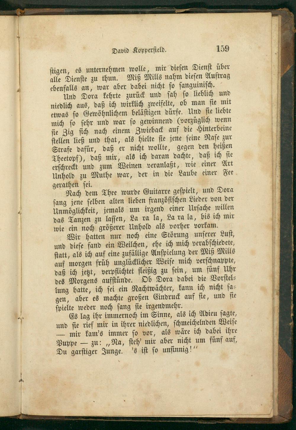 Wir hatten nur noch eine Störung unſerer Luſt, und dieſe fand ein Weilchen, ehe ich mich verabſchiedete, ſtatt, als ich auf eine zufällige Anſpielung der Miß Mills auf morgen früh unglücklicher Weiſe mich verſchnappte, daß ich jetzt, verpflichtet fleißig zu ſein, um fünf Uhr des Morgens aufſtünde. Ob Dora dabei die Vorſtel⸗ lung hatte, ich ſei ein Nachtwächter, kann ich nicht ſa⸗ gen, aber es machte großen Eindruck auf ſie, und ſie ſpielte weder noch ſang ſie irgendmehr.