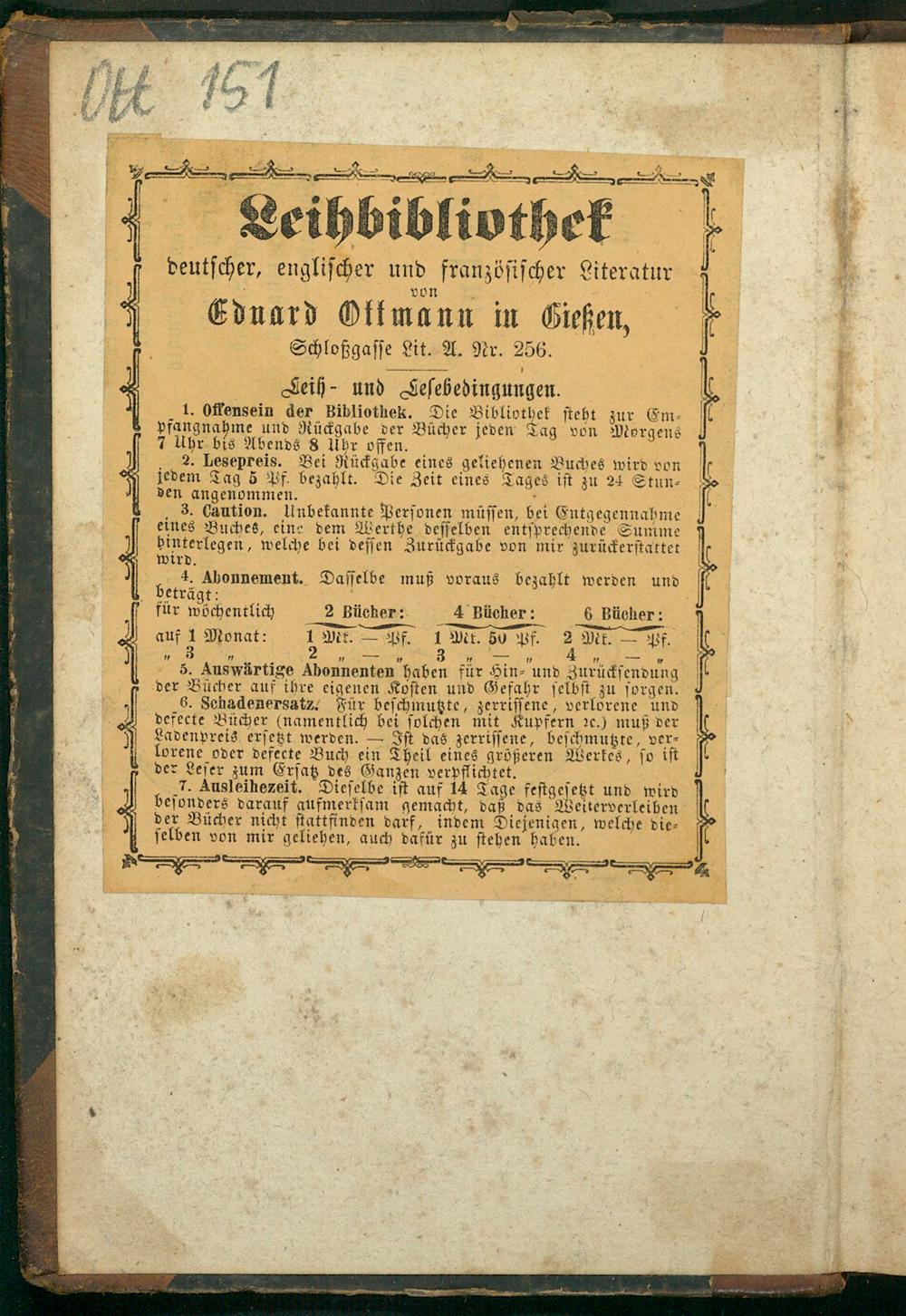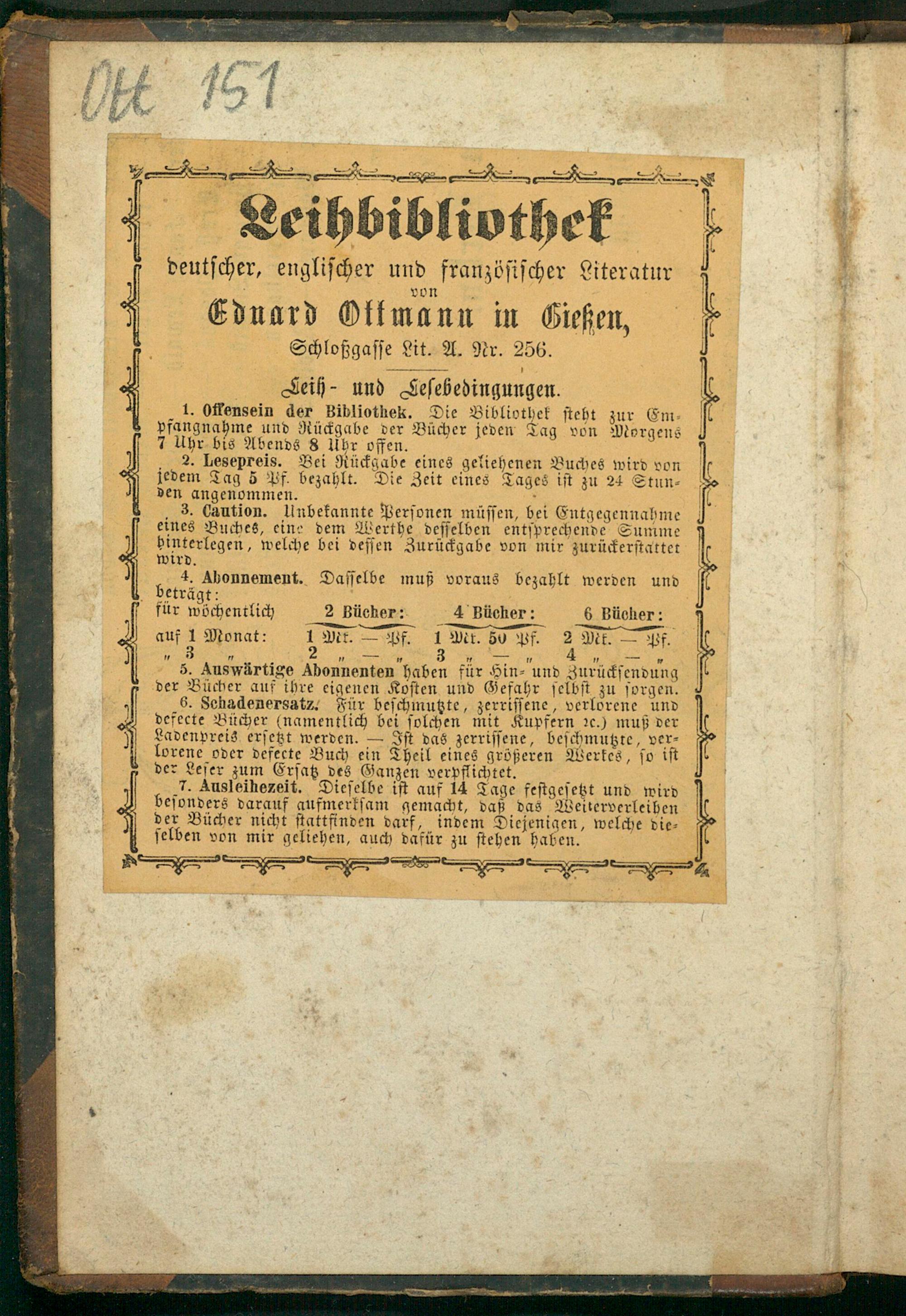 Seih- und Ceſebedingungen. 1. Offensein der Bibliothek. Die Bibliothek ſteht zur Em⸗ pfangnahme und Rückgabe der Bücher jeden Tag von Morgens 7 Uhr bis Abends 8 Uhr offen. 3 2. Lesepreis. Bei Rückgabe eines geliehenen Buches wird von jedem Tag 5 Pf bezahlt. Die Zeit eines Tages iſt zu 24 Stun⸗ den angenommen.——. .3. Caution. Unbekannte Perſonen müſſen, bei Entgegennahme eines Buches, eine dem Werthe deſſelben entſprechende Summe binterlegen, welche bei deſſen Zurückgabe von mir zurückerſtattet wird.