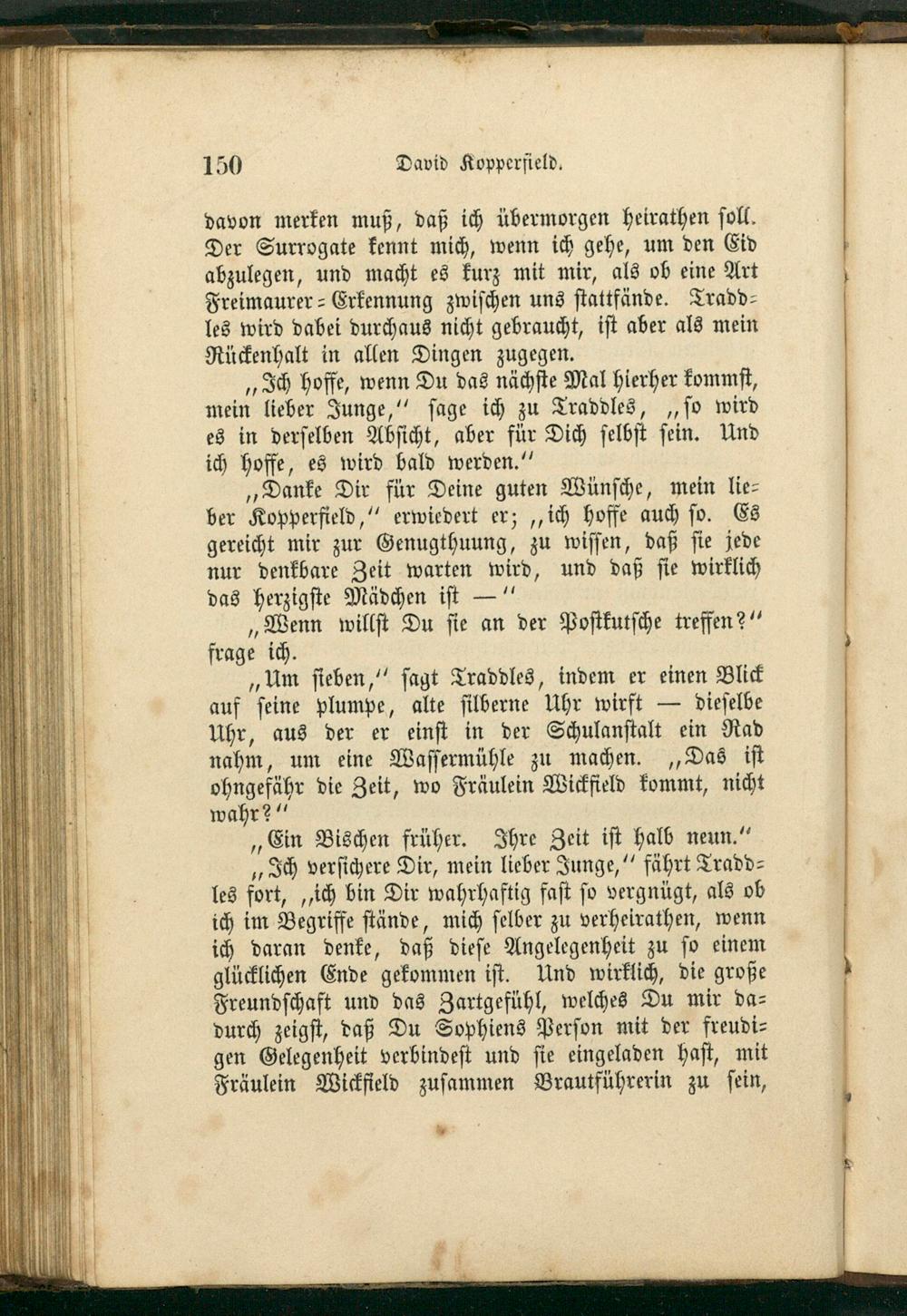 „Ich verſichere Dir, mein lieber Junge,“ fährt Tradd⸗ les fort,„ich bin Dir wahrhaftig faſt ſo vergnügt, als ob ich im Begriffe ſtände, mich ſelber zu verheirathen, wenn ich daran denke, daß dieſe Angelegenheit zu ſo einem glücklichen Ende gekommen iſt. Und wirklich, die große Freundſchaft und das Zartgefühl, welches Du mir da⸗ durch zeigſt, daß Du Sophiens Perſon mit der freudi⸗ gen Gelegenheit verbindeſt und ſie eingeladen haſt, mit Fräulein Wickfield zuſammen Brautführerin zu ſein,