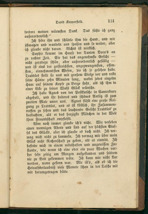 Sophie kommt im Hauſe der Tanten Dora's an zu rechter Zeit. Sie hat das angenehmſte Geſicht— nicht geradezu ſchön, aber außerordentlich gefällig— und iſt eins der geiſtreichſten, ungezwungenſten, offen⸗ ſten, einnehmendſten Weſen, die ich je geſehen habe. Traddles ſtellt ſie uns mit großem Stolze vor und reibt ſeine Hände zehn Minuten lang, wobei jedes einzelne Haar auf ſeinem Kopfe zu Berge ſteht, als ich ihm in einer Ecke zu ſeiner Wahl Glück wünſche.