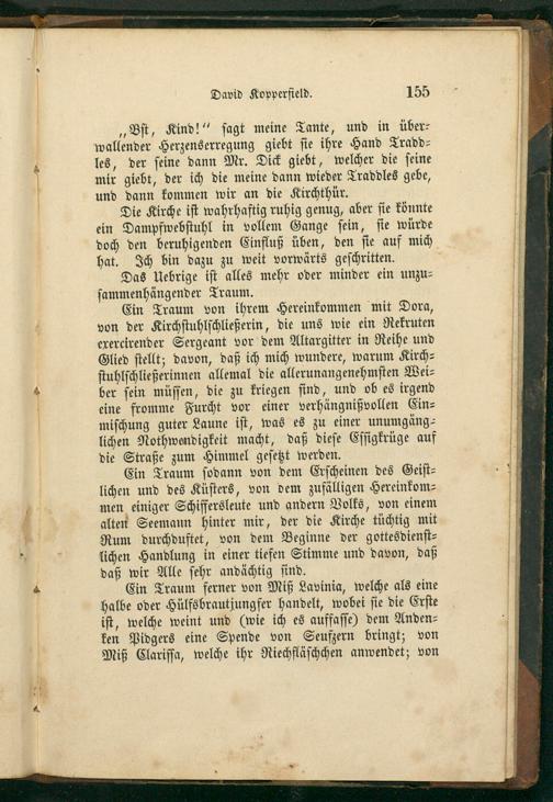 „Bſt, Kind!“ ſagt meine Tante, und in über⸗ wallender Herzenserregung giebt ſie ihre Hand Tradd⸗ les, der ſeine dann Mr. Dick giebt, welcher die ſeine mir giebt, der ich die meine dann wieder Traddles gebe, und dann kommen wir an die Kirchthür.