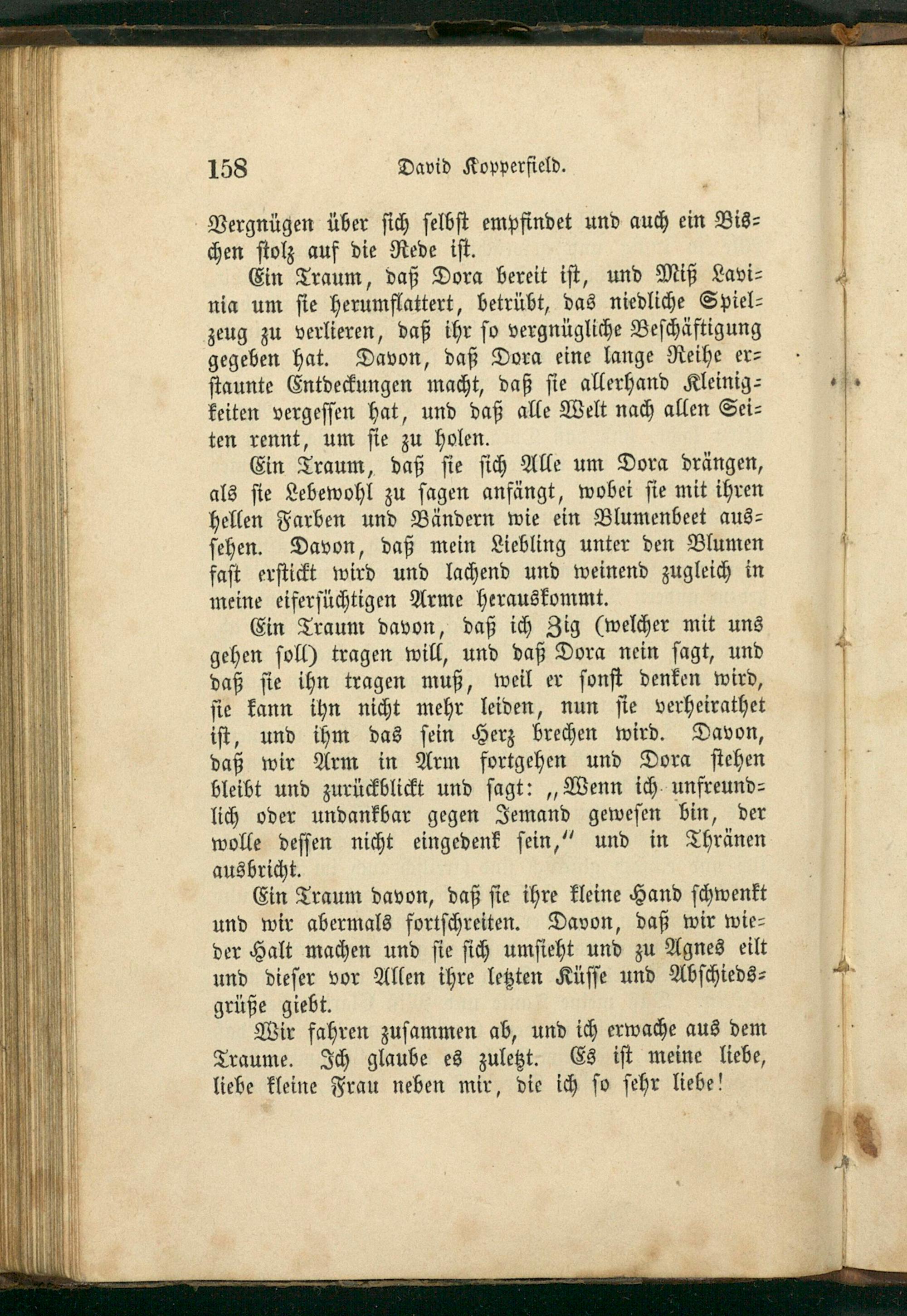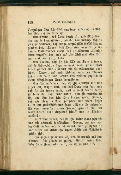 Ein Traum davon, daß ich Zig(welcher mit uns gehen ſoll) tragen will, und daß Dora nein ſagt, und daß ſie ihn tragen muß, weil er ſonſt denken wird, ſie kann ihn nicht mehr leiden, nun ſie verheirathet iſt, und ihm das ſein Herz brechen wird. Davon, daß wir Arm in Arm fortgehen und Dora ſtehen bleibt und zurückblickt und ſagt:„Wenn ich unfreund⸗ lich oder undankbar gegen Jemand geweſen bin, der wolle deſſen nicht eingedenk ſein,“ und in Thränen ausbricht.