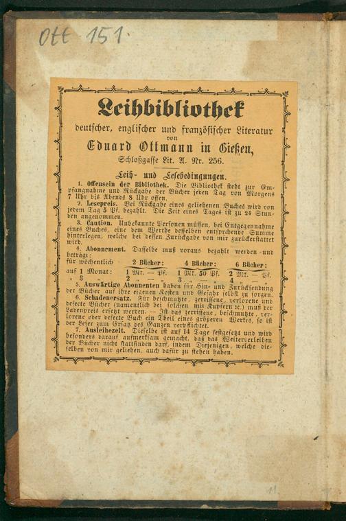 von Eduard Oftmann in Gießen, Schloßgaſſe Lit. A. Nr. 256. eih- und Jeſebedingungen. 1. Offensein der Bibliothek. Die Bibliothek ſteht zur Em⸗