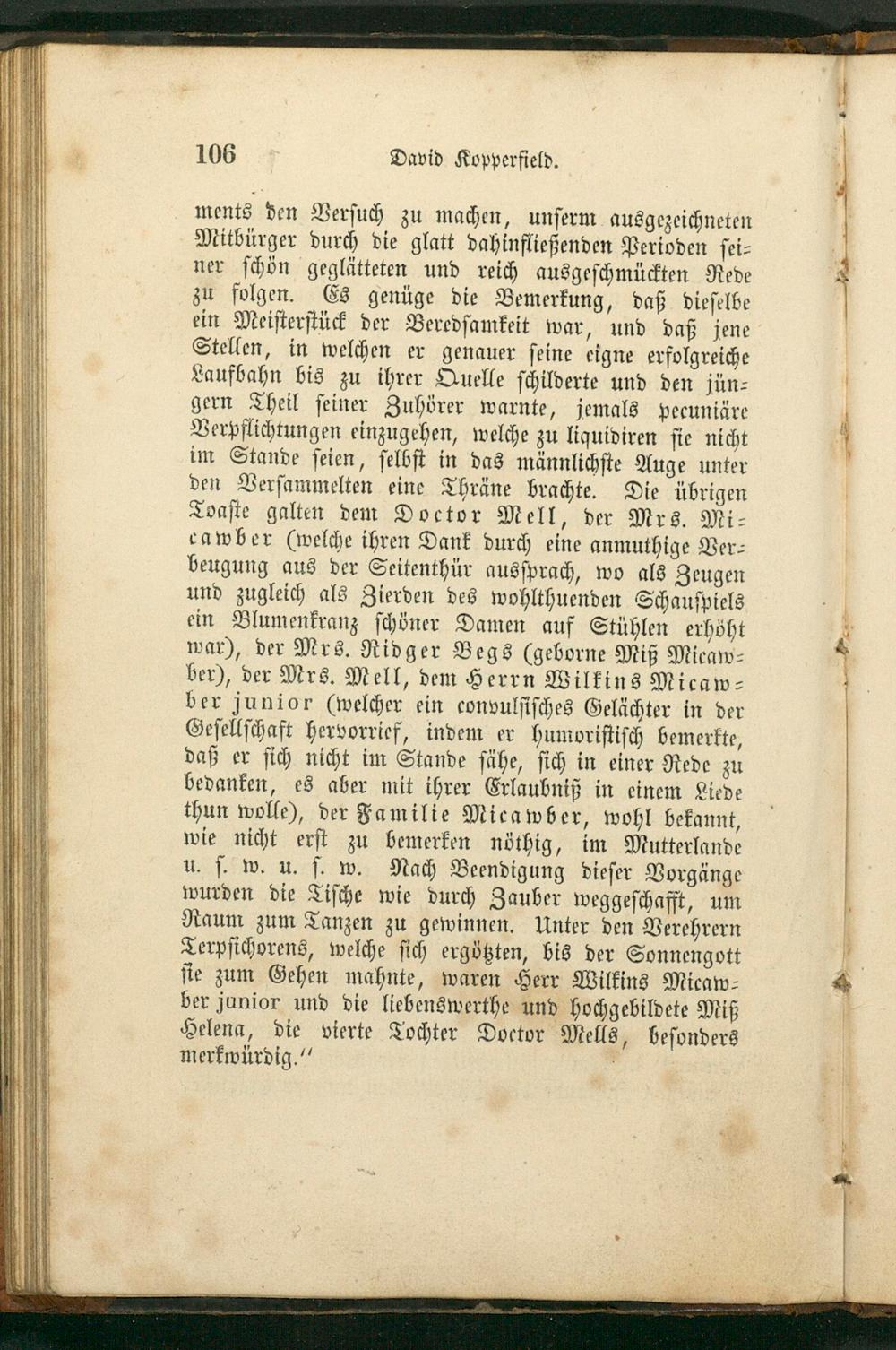 ments den Verſuch zu machen, unſerm ausgezeichneten Mitbürger durch die glatt dahinfließenden Perioden ſei⸗ ner ſchön geglätteten und reich ausgeſchmückten Rede zu folgen. Es genüge die Bemerkung, daß dieſelbe ein Meiſterſtück der Beredſamkeit war, und daß jene Stellen, in welchen er genauer ſeine eigne erfolgreiche Laufbahn bis zu ihrer Quelle ſchilderte und den jün⸗ gern Theil ſeiner Zuhörer warnte, jemals pecuniäre Verpflichtungen einzugehen, welche zu liquidiren ſie nicht im Stande ſeien, ſelbſt in das männlichſte Auge unter den Verſammelten eine Thräne brachte. Die übrigen Toaſte galten dem Doctor Mell, der Mrs. Mi⸗ rawber(welche ihren Dank durch eine anmuthige Ver⸗ beugung aus der Seitenthür ausſprach, wo als Zeugen und zugleich als Zierden des wohlthuenden Schauſpiels ein Blumenkranz ſchöner Damen auf Stühlen erhöht war), der Mrs. Ridger Begs(geborne Miß Micaw⸗ ber), der Mrs. Mell, dem Herrn Wilkins Micaw⸗ ber junior(welcher ein convulſiſches Gelächter in der Geſellſchaft hervorrief, indem er humoriſtiſch bemerkte, daß er ſich nicht im Stande ſähe, ſich in einer Rede zu bedanken, es aber mit ihrer Erlaubniß in einem Liede thun wolle), der Familie Micawber, wohl bekannt, wie nicht erſt zu bemerken nöthig, im Mutterlande u. ſ. w. u. ſ. w. Nach Beendigung dieſer Vorgänge wurden die Tiſche wie durch Zauber weggeſchafft, um Raum zum Tanzen zu gewinnen. Unter den Verehrern Terpſichorens, welche ſich ergötzten, bis der Sonnengott ſie zum Gehen mahnte, waren Herr Wilkins Micaw⸗ ber junior und die liebenswerthe und hochgebildete Miß Helena, die vierte Tochter Doctor Mells, beſonders merkwürdig.“ 1