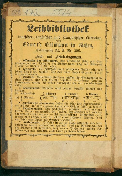 3.(aution. Unbekannte Perſonen müſſen, bei Entgegennahme eines Buches, eine dem Werthe deſſelben entſprchende Summe hinterlenen welche bei deſſen Zurückgabe von mir zurückerſtattet wird.