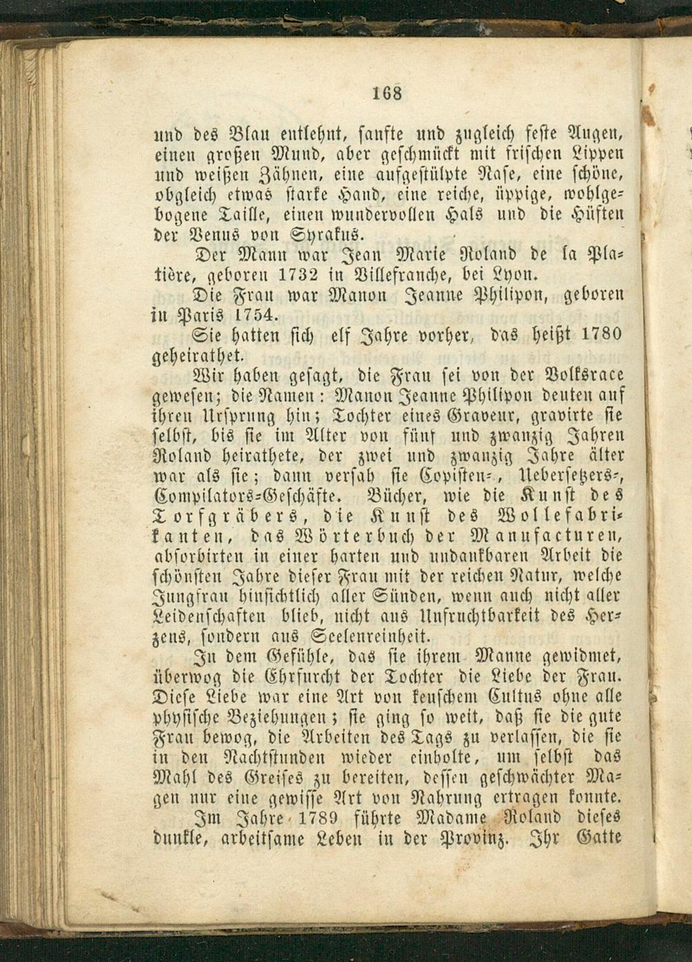 Wir haben geſagt, die Frau ſei von der Volksrace geweſen; die Namen: Manon Jeanne Philipon deuten auf ihren Urſprung hin; Tochter eines Graveur, gravirte ſi ſie ſelbſt, bis ſie im Alter von fünf und zwanzig Jahren Roland heirathete, der zwei und zwanzig Jahre älter war als ſie; dann verſah ſie Copiſten⸗, Ueberſetzers⸗, Compilators⸗Geſchäfte. Bücher, wie die Kunſt des Torfgräbers, die Kunſt des Wollefabri⸗ kanten, das Wörterbuch der Manufacturen, abſorbirten in einer harten und undankbaren Arbeit die ſchönſten Jahre dieſer Frau mit der reichen Natur, welche Jungfrau hinſichtlich aller Sünden, wenn auch nicht aller Leidenſchaften blieb, nicht aus Unfruchtbarkeit des Her⸗ zens, ondern aus Seelenreinheit.