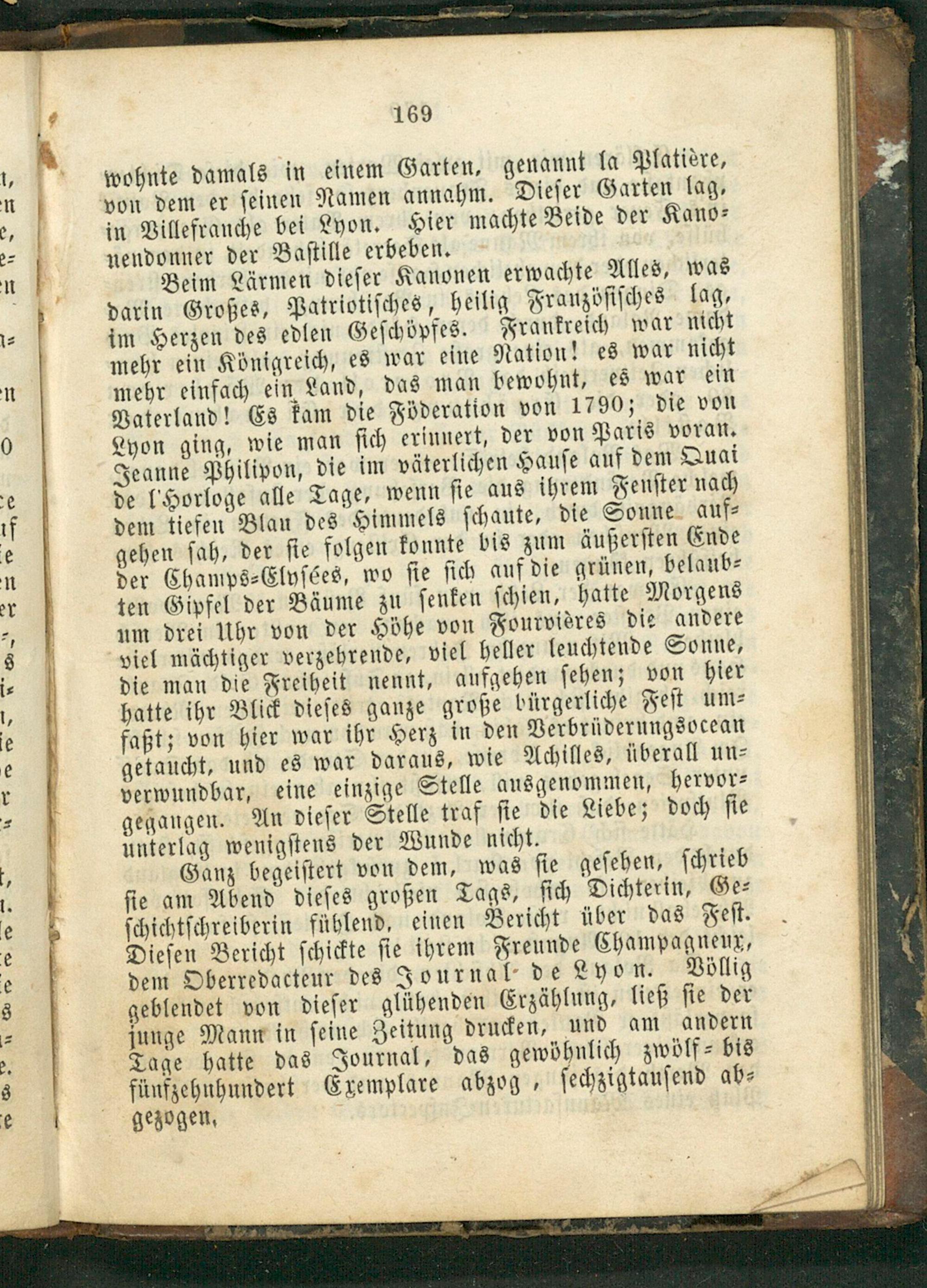 Beim Lärmen dieſer Kanonen erwachte Alles, was darin Großes, Patriotiſches, heilig Franzöſiſches lag, im Herzen des edlen Geſchöpfes. Frankreich war nicht mehr ein Königreich, es war eine Nation! es war nicht mehr einfach ein Land, das man bewohnt, es war ein Vaterland! Es kam die Föderation von 1790; die von Vyon ging, wie man ſich erinnert, der von Paris voran. Jeanne Philipon, die im väterlichen Hauſe auf dem Quai de[Horloge alle Tage, wenn ſie aus ihrem Fenſter nach dem tiefen Blau des Himmels ſchaute, die Sonne auf⸗ gehen ſah, der ſie folgen konnte bis zum äußerſten Ende der Champs⸗Elyſées, wo ſie ſich auf die grünen, belaub⸗ ten Gipfel der Bäume zu ſenken ſchien, hatte Morgens um drei Uhr von der Höhe von Fourvidres die andere viel mächtiger verzehrende, viel heller leuchtende Sonue, die man die Freiheit nennt, aufgehen ſehen; von hier hatte ihr Blick dieſes ganze große bürgerliche Feſt um⸗ faßt; von hier war ihr Herz in den Verbrüderungsocean getaucht, und es war daraus, wie Achilles, überall un⸗ verwundbar, eine einzige Stelle ausgenommen, hervor⸗ gegangen. An dieſer Stelle traf ſie die Liebe; doch ſie unterlag wenigſtens der Wunde nicht.