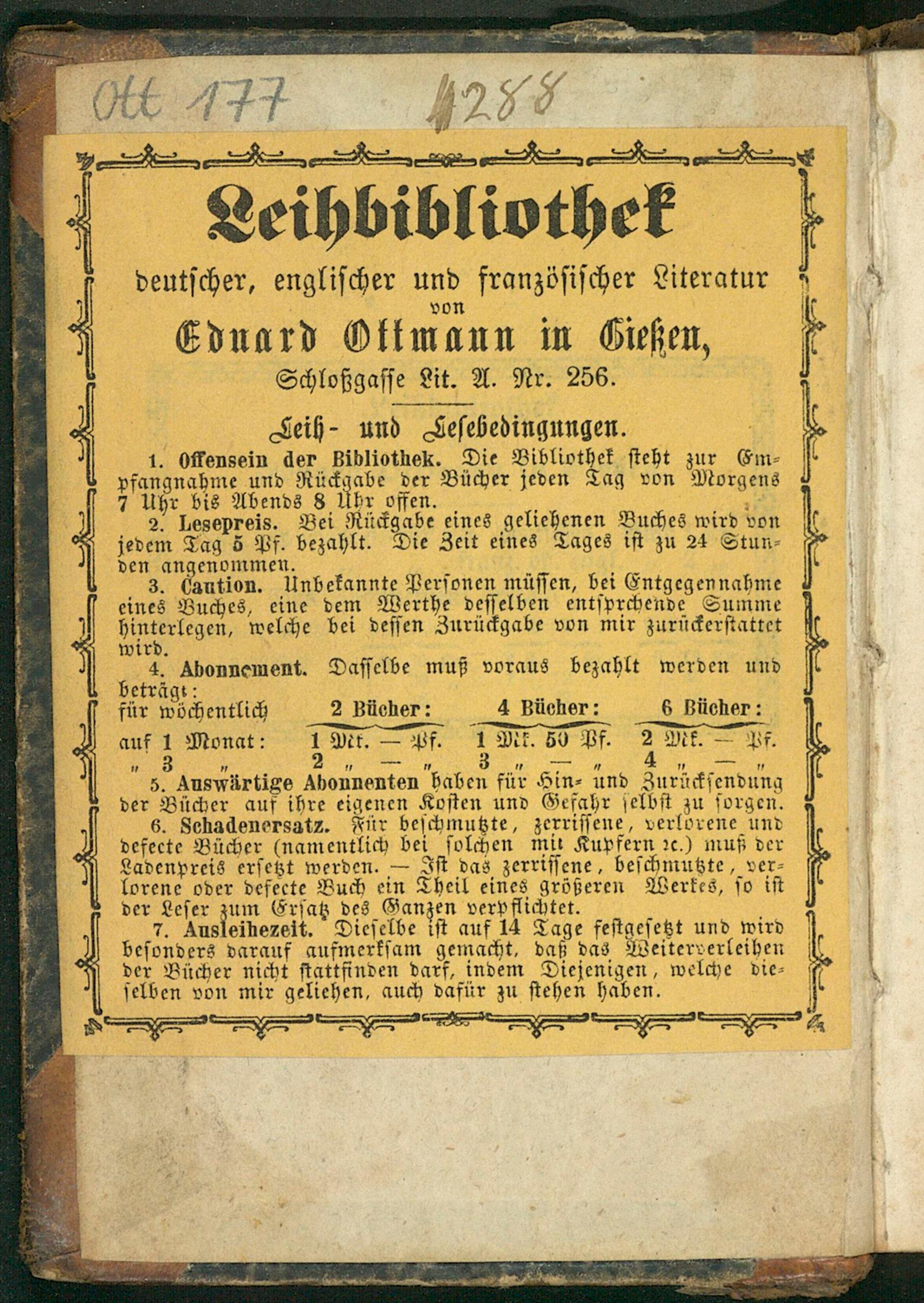 7. Ausleihezeit. Dieſelbe iſt auf 14 Tage feſtgeſetzt und wird beſonders darauf aufmerkſam gemacht, daß das Weiterverleihen der Bücher nicht ſtattfinden darf, indem Diejenigen, welche vie⸗ ſelben von mir geliehen, auch dafür zu ſtehen haben.