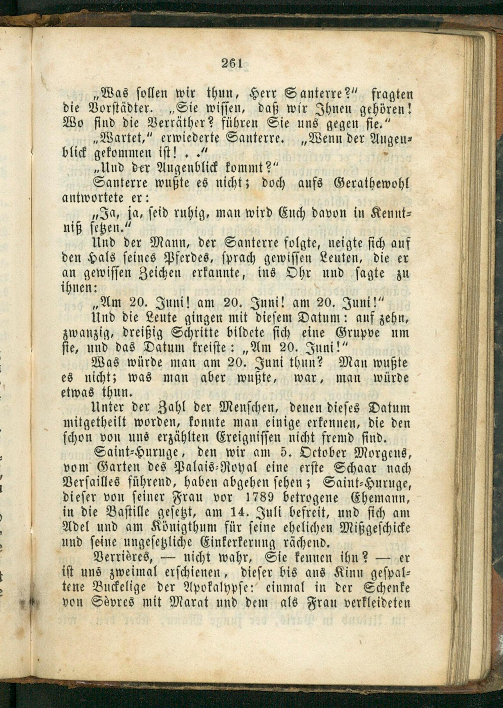 Saint⸗Huruge, den wir am 5. October Morgens, vom Garten des Palais⸗Royal eine erſte Schaar nach Verſailles führend, haben abgehen ſehen; Saint⸗Huruge, dieſer von ſeiner Frau vor 1789 betrogene Ehemann, in die Baſtille geſetzt, am 14. Juli befreit, und ſich am Adel und am Königthum für ſeine ehelichen Mißgeſchicke und ſeine ungeſetzliche Einkerkerung rächend.