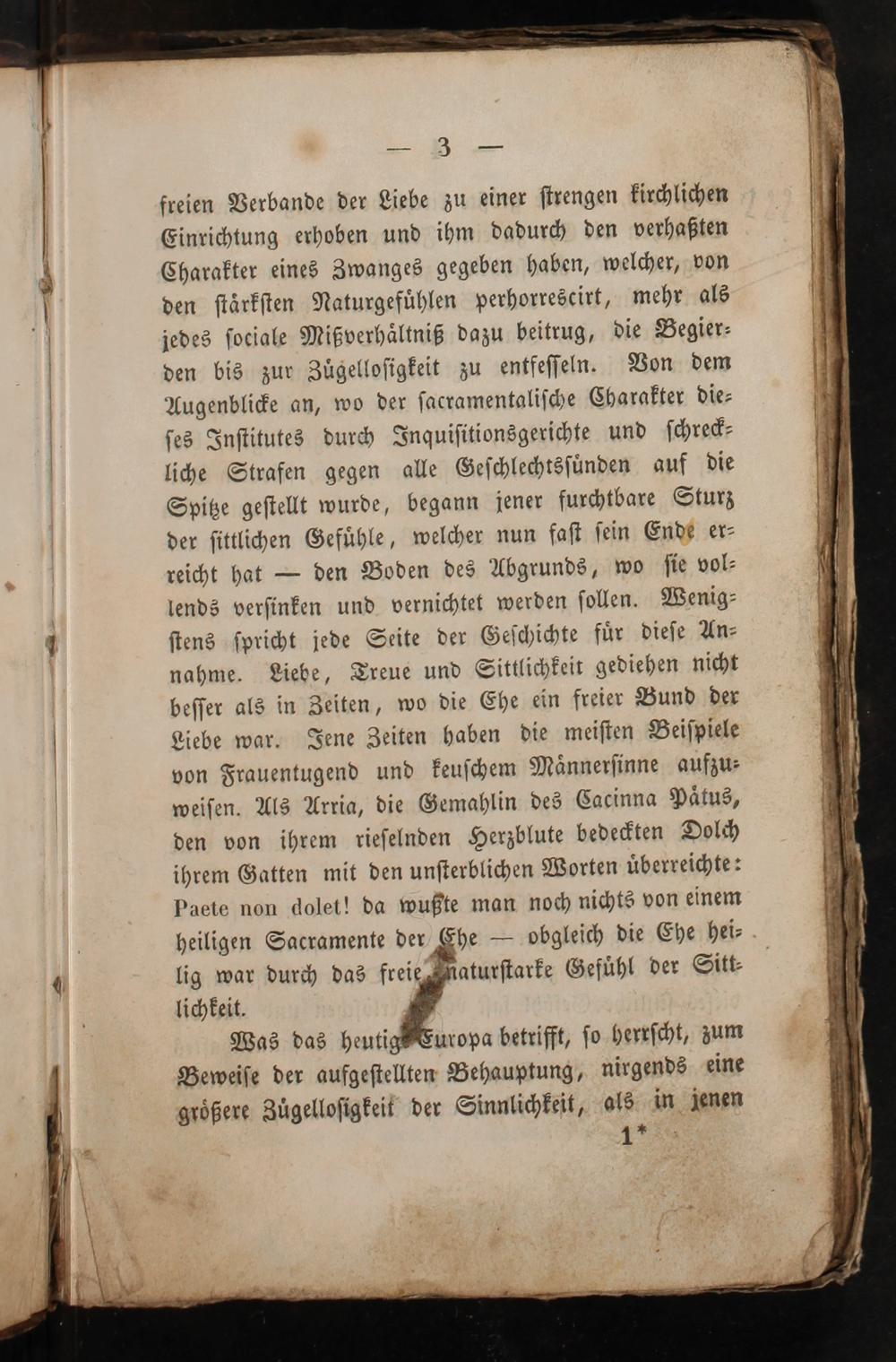 freien Verbande der Liebe zu einer ſtrengen kirchlichen Einrichtung erhoben und ihm dadurch den verhaßten Charakter eines Zwanges gegeben haben, welcher, von den ſtaͤrkſten Naturgefuͤhlen perhorrescirt, mehr als jedes ſociale Mißverhältniß dazu beitrug, die Begier⸗ den bis zur Zügelloſigkeit zu entfeſſeln. Von dem Augenblicke an, wo der ſacramentaliſche Charakter die⸗ ſes Inſtitutes durch Inquiſitionsgerichte und ſchreck⸗ liche Strafen gegen alle Geſchlechtsſuͤnden auf die Spitze geſtellt wurde, begann jener furchtbare Sturz der ſittlichen Gefuͤhle, welcher nun faſt ſein Ende er⸗ reicht hat— den Boden des Abgrunds, wo ſie vol⸗ lends verſinken und vernichtet werden ſollen. Wenig⸗ ſtens ſpricht jede Seite der Geſchichte fuͤr dieſe An⸗ nahme. Liebe, Treue und Sittlichkeit gediehen nicht beſſer als in Zeiten, wo die Ehe ein freier Bund der Liebe war. Jene Zeiten haben die meiſten Beiſpiele von Frauentugend und keuſchem Maͤnnerſinne aufzu⸗ weiſen. Als Arria, die Gemahlin des Cacinna Paͤtus, den von ihrem rieſelnden Herzblute bedeckten Dolch ihrem Gatten mit den unſterblichen Worten uberreichte: Paete non dolet! da wußte man noch nichts von einem heiligen Sacramente der Ehe— obgleich die Ehe hei⸗ lig war durch das freie aturſtarke Gefuͤhl der Sitt⸗ lichkeit.