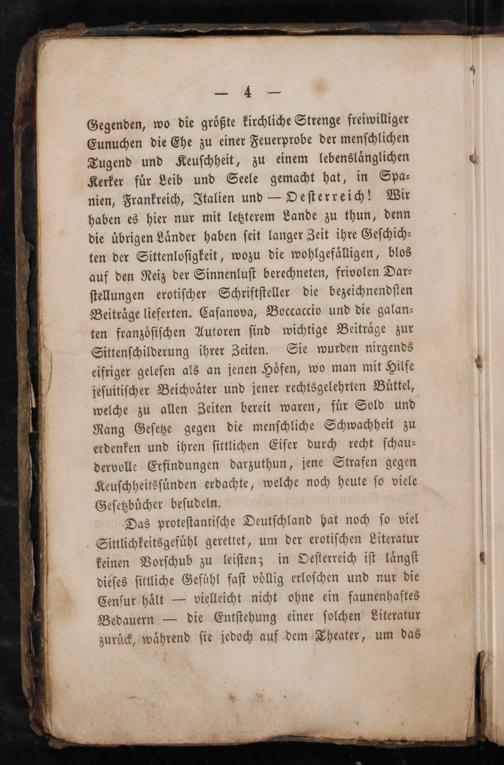 Das proteſtantiſche Deutſchland hat noch ſo viel Sittlichkeitsgefuͤhl gerettet, um der erotiſchen Literatur keinen Vorſchub zu leiſten; in Oeſterreich iſt laͤngſt dieſes ſittliche Gefühl faſt völlig erloſchen und nur die Cenſur haͤlt— vielleicht nicht ohne ein faunenhaftes Bedauern— die Entſtehung einer ſolchen Literatur zuruͤck, waͤhrend ſie jedoch auf dem Theater, um das