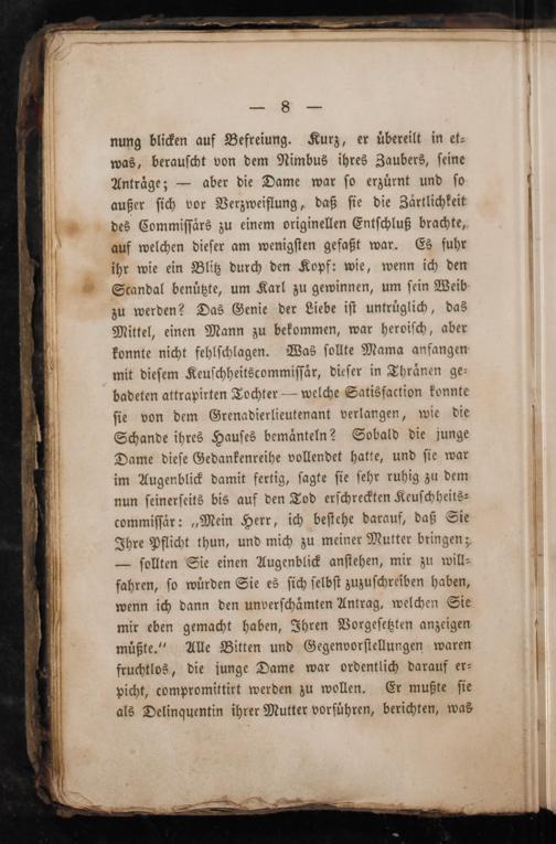 nung blicken auf Befreiung. Kurz, er übereilt in et⸗ was, berauſcht von dem Nimbus ihres Zaubers, ſeine Antraͤge;— aber die Dame war ſo erzuͤrnt und ſo außer ſich vor Verzweiflung, daß ſie die Zaͤrtlichkeit des Commiſſaͤrs zu einem originellen Entſchluß brachte, auf welchen dieſer am wenigſten gefaßt war. Es fuhr ihr wie ein Blitz durch den Kopf: wie, wenn ich den Scandal benutzte, um Karl zu gewinnen, um ſein Weib zu werden? Das Genie der Liebe iſt untruͤglich, das Mittel, einen Mann zu bekommen, war heroiſch, aber konnte nicht fehlſchlagen. Was ſollte Mama anfangen mit dieſem Keuſchheitscommiſſaͤr, dieſer in Thraͤnen ge⸗ badeten attrapirten Tochter— welche Satisfaction konnte ſie von dem Grenadierlieutenant verlangen, wie die Schande ihres Hauſes bemänteln? Sobald die junge Dame dieſe Gedankenreihe vollendet hatte, und ſie war im Augenblick damit fertig, ſagte ſie ſehr ruhig zu dem nun ſeinerſeits bis auf den Tod erſchreckten Keuſchheits⸗ commiſſär:„Mein Herr, ich beſtehe darauf, daß Sie Ihre Pflicht thun, und mich zu meiner Mutter bringen; — ſollten Sie einen Augenblick anſtehen, mir zu will⸗ fahren, ſo wurden Sie es ſich ſelbſt zuzuſchreiben haben, wenn ich dann den unverſchaͤmten Antrag, welchen Sie mir eben gemacht haben, Ihren Vorgeſetzten anzeigen muͤßte.“ Alle Bitten und Gegenvorſtellungen waren fruchtlos, die junge Dame war ordentlich darauf er⸗ picht, compromittirt werden zu wollen. Er mußte ſie als Delinquentin ihrer Mutter vorfuͤhren, berichten, was