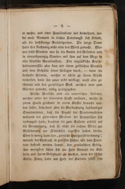 Solche Vorfaͤlle und ein ordentlicher Aufruhr, welcher unter der dienenden Claſſe entſtand, welche in jedem Hauſe gleichwie in einem Kloſter bewacht wer⸗ den ſollte, beſonders aber die Beobachtung ſachkundiger Staatsmaͤnner, daß die Anzahl der Freudenmaͤdchen waͤhrend des glorreichen Waltens der Commiſſion ſich verdoppelt hatte, brachten die gute Kaiſerin endlich auf die Vermuthung, daß ſie nicht die rechten Mittel zur Befoͤrderung der Sittlichkeit ergriffen haben duͤrfte. Eben ſo wenig hatte ihre„peinliche Halsgerichtsordnung“, wonach der Ehebruch in gewiſſen Faͤllen mit dem Feuer⸗ tode beſtraft werden konnte, den erwuͤnſchten Erfolg. Am wenigſten ſchien ſich der Herr Gemahl der Kai⸗ ſerin aus ihrem Geſetzbuche zu machen, denn der ſchoͤne Kaiſer Franz halte am Hofe der Kaiſerin ſelbſt ſein
