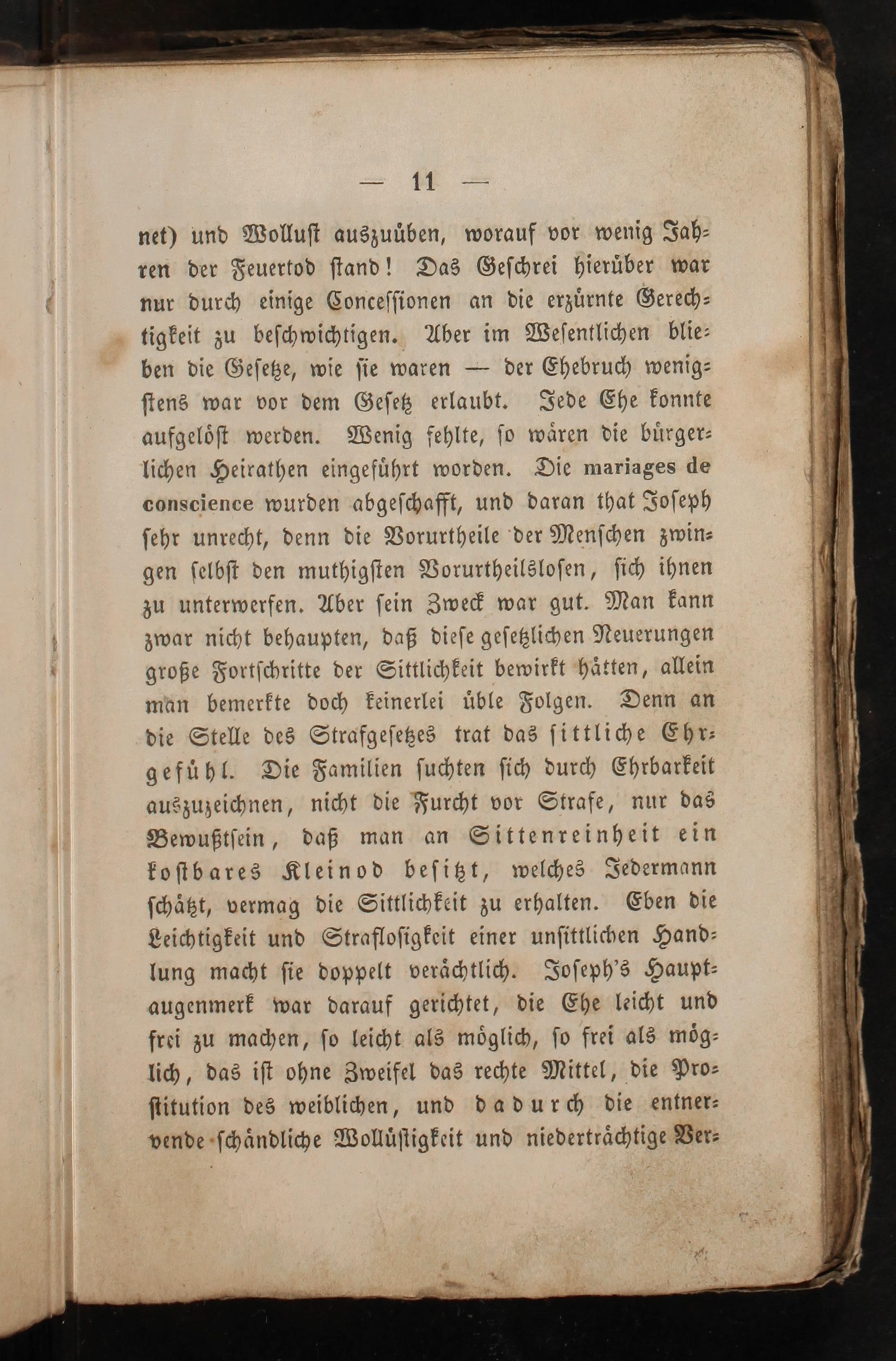 net) und Wolluſt auszuüben, worauf vor wenig Jah⸗ ren der Feuertod ſtand! Das Geſchrei hieruͤber war nur durch einige Conceſſionen an die erzuͤrnte Gerech⸗ tigkeit zu beſchwichtigen. Aber im Weſentlichen blie⸗ ben die Geſetze, wie ſie waren— der Ehebruch wenig⸗ ſtens war vor dem Geſetz erlaubt. Jede Ehe konnte aufgeloͤſt werden. Wenig fehlte, ſo waͤren die buͤrger⸗ lichen Heirathen eingefuͤhrt worden. Die mariages de conscience wurden abgeſchafft, und daran that Joſeph ſehr unrecht, denn die Vorurtheile der Menſchen zwin⸗ gen ſelbſt den muthigſten Vorurtheilsloſen, ſich ihnen zu unterwerfen. Aber ſein Zweck war gut. Man kann zwar nicht behaupten, daß dieſe geſetzlichen Neuerungen große Fortſchritte der Sittlichkeit bewirkt haͤtten, allein man bemerkte doch keinerlei uͤble Folgen. Denn an die Stelle des Strafgeſetzes trat das ſittliche Ehr⸗ gefuͤhl. Die Familien ſuchten ſich durch Ehrbarkeit auszuzeichnen, nicht die Furcht vor Strafe, nur das Bewußtſein, daß man an Sittenreinheit ein koſtbares Kleinod beſitzt, welches Jedermann ſchätzt, vermag die Sittlichkeit zu erhalten. Eben die Leichtigkeit und Strafloſigkeit einer unſittlichen Hand⸗ lung macht ſie doppelt veraͤchtlich. Joſeph's Haupt⸗ augenmerk war darauf gerichtet, die Ehe leicht und frei zu machen, ſo leicht als moͤglich, ſo frei als mög⸗ lich, das iſt ohne Zweifel das rechte Mittel, die Pro⸗ ſtitution des weiblichen, und dadurch die entner⸗ vende ſchaͤndliche Wolluͤſtigkeit und niedertraͤchtige Ver⸗