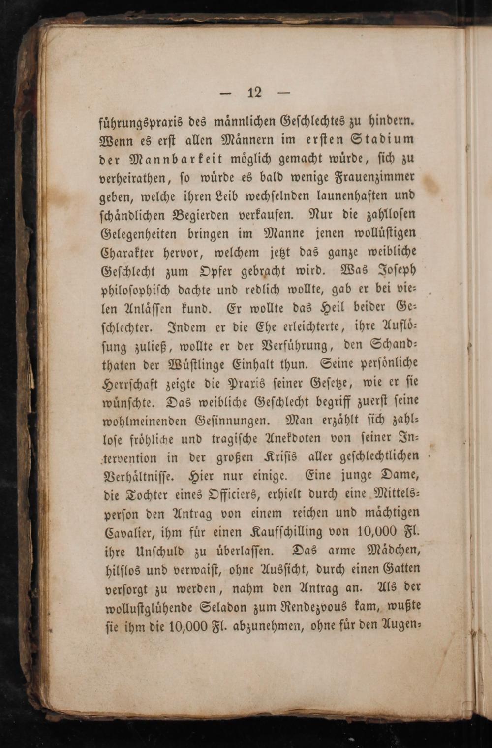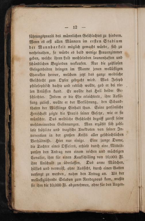 fuͤhrungspraxis des maͤnnlichen Geſchlechtes zu hindern. Wenn es erſt allen Maͤnnern im erſten Stadium der Mannbarkeit moͤglich gemacht wuͤrde, ſich zu verheirathen, ſo wuͤrde es bald wenige Frauenzimmer geben, welche ihren Leib wechſelnden launenhaften und ſchändlichen Begierden verkaufen. Nur die zahlloſen Gelegenheiten bringen im Manne jenen wolluͤſtigen Charakter hervor, welchem jetzt das ganze weibliche Geſchlecht zum Opfer gebracht wird. Was Joſeph philoſophiſch dachte und redlich wollte, gab er bei vie⸗ len Anlaͤſſen kund. Er wollte das Heil beider Ge⸗ ſchlechter. Indem er die Ehe erleichterte, ihre Aufloͤ⸗ ſung zuließ, wollte er der Verführung, den Schand⸗ thaten der Wuͤſtlinge Einhalt thun. Seine perſoͤnliche Herrſchaft zeigte die Praxis ſeiner Geſetze, wie er ſie wuͤnſchte. Das weibliche Geſchlecht begriff zuerſt ſeine wohlmeinenden Geſinnungen. Man erzählt ſich zahl⸗ loſe frohliche und tragiſche Anekdoten von ſeiner In⸗