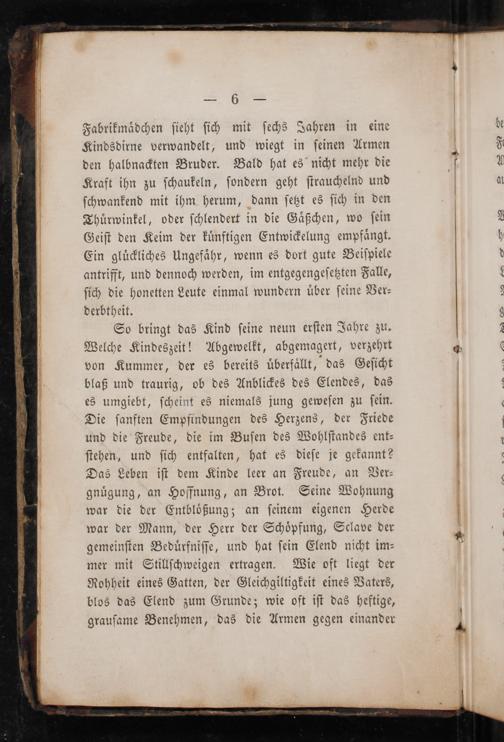 So bringt das Kind ſeine neun erſten Jahre zu. Welche Kindeszeit! Abgewelkt, abgemagert, verzehrt von Kummer, der es bereits uͤberfallt, das Geſicht blaß und traurig, ob des Anblickes des Elendes, das es umgiebt, ſcheint es niemals jung geweſen zu ſein. Die ſanften Empfindungen des Herzens, der Friede und die Freude, die im Buſen des Wohlſtandes ent⸗ ſtehen, und ſich entfalten, hat es dieſe je gekannt? Das Leben iſt dem Kinde leer an Freude, an Ver⸗ gnuͤgung, an Hoffnung, an Brot. Seine Wohnung war die der Entbloͤßung; an ſeinem eigenen Herde war der Mann, der Herr der Schoͤpfung, Sclave der gemeinſten Beduͤrfniſſe, und hat ſein Elend nicht im⸗ mer mit Stillſchweigen ertragen. Wie oft liegt der Rohheit eines Gatten, der Gleichgiltigkeit eines Vaters, blos das Elend zum Grunde; wie oft iſt das heftige, grauſame Benehmen, das die Armen gegen einander